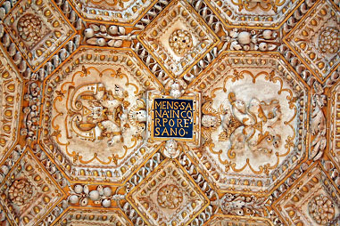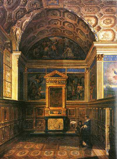 Des stucs blancs de la voûte à caissons aux lambris en bois des murs en passant par la suite de tableaux des figures de l'Ancien Testament (encore visibles, cf. ci-contre) et les carreaux en faïence du pavement (cf. détail en-dessous; manufacture de Masséot Abaquesne à Rouen), l'unité esthétique de la chapelle devait être remarquable comme en témoigne le tableau exécuté en 1880 par un peintre originaire de Turin, Giuseppe Uberti (voir ci-contre).