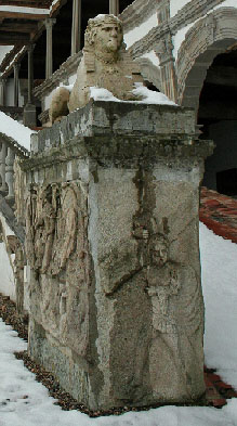 Sur sa poitrine, cette dernière porte un cartouche sur lequel est inscrite en latin la devise "Sphyngem habe domi" : inscription relativement obscure qui offre diverses traductions parmi lesquelles "Garde ton secret chez toi", "Garde un secret en ton coeur" ou bien encore "Aie un sphynx chez toi"...Le socle sur lequel est accroupie la créature est lui-même orné de pseudo-hiéroglyphes : il s'agit de la reproduction avec quelques maladresses d'une inscription d'Achoris, pharaon de la XXIXème dynastie.