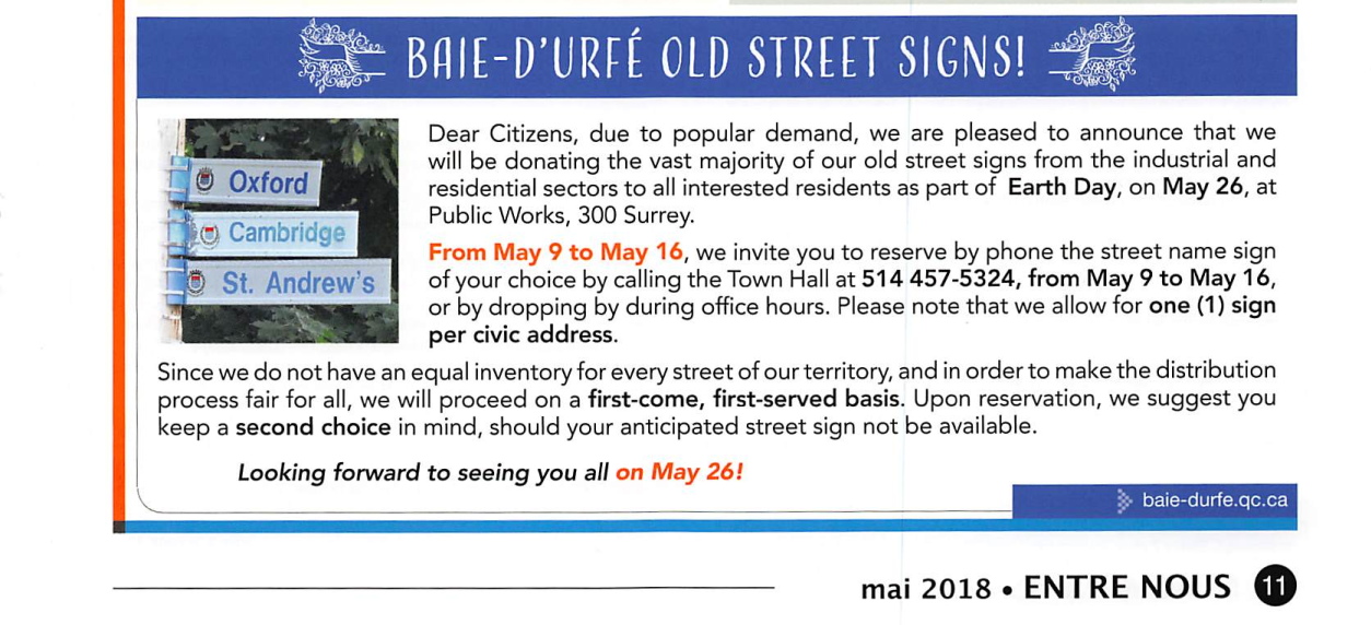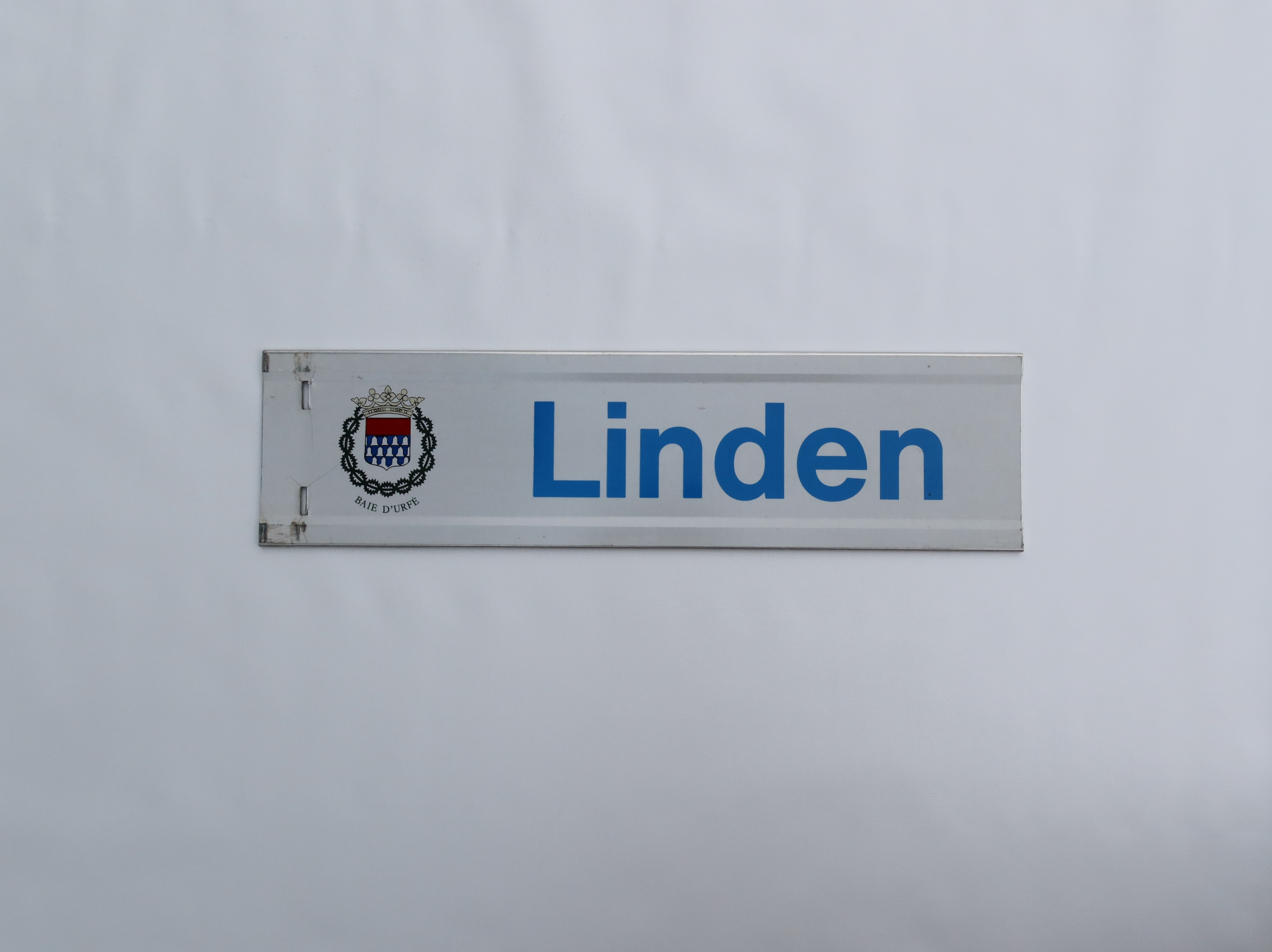 The first Baie-D'Urfe street signs where installed before the creation of the official coat of arms. Most of them were installed in the 1950s and 1960s. They were made from steel painted in black and white. They were 1 1/2 inch thick and hollow inside to save on weight. Never the less they were extremely heavy and durable. Some people have kept those signs and you can see them below. A second generation of signs was made from aluminum with letters in blue on a white background and the coat of arms was printed next to the street name. This second generation of signs was phased out in 2018. The third and current generation of street signs are also made from aluminum. They are blue with letters in white. The coat of arms is shown above the street name.