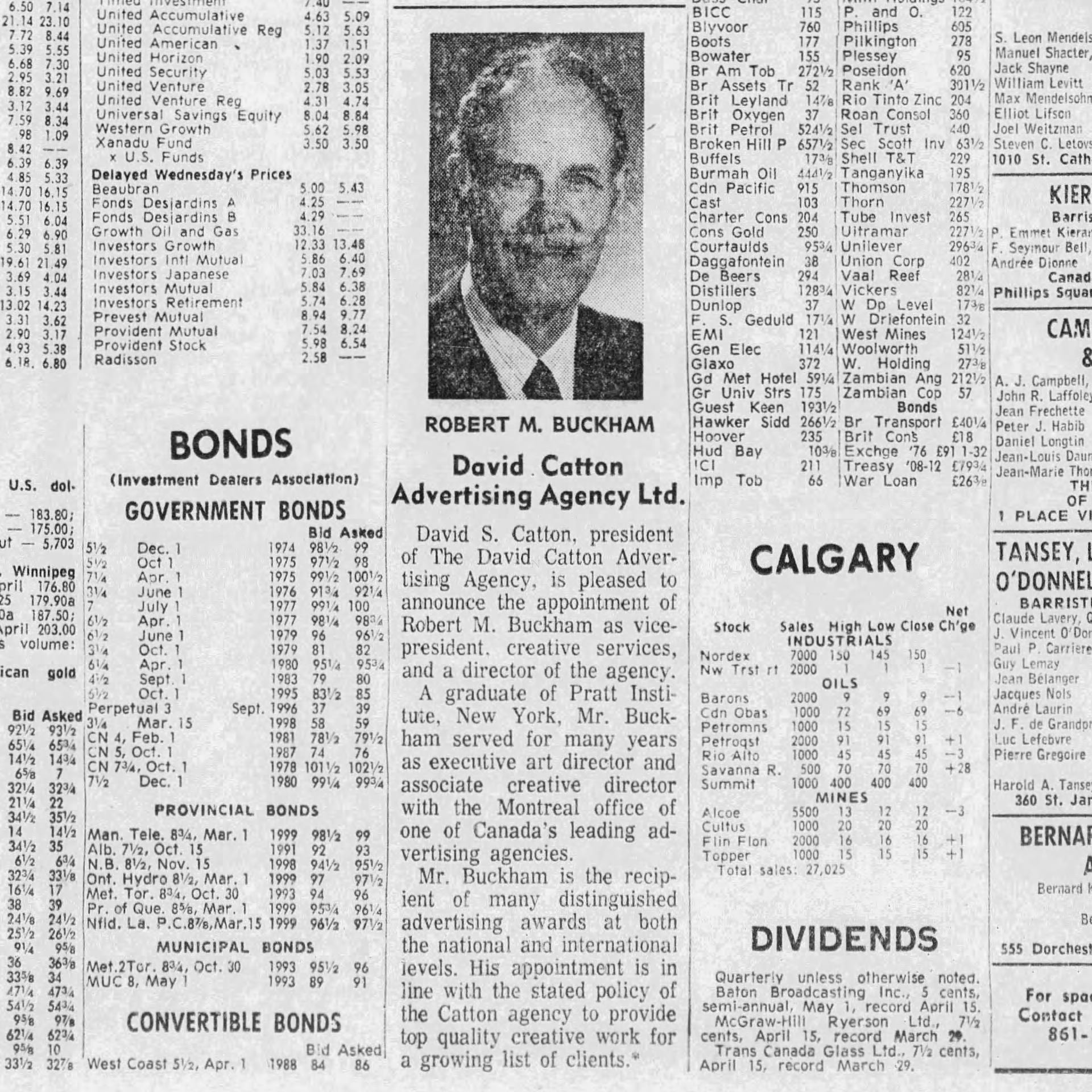 Robert M. Buckham joins the David Catton Advertising Agency, The Gazette, Mar. 22, 1974