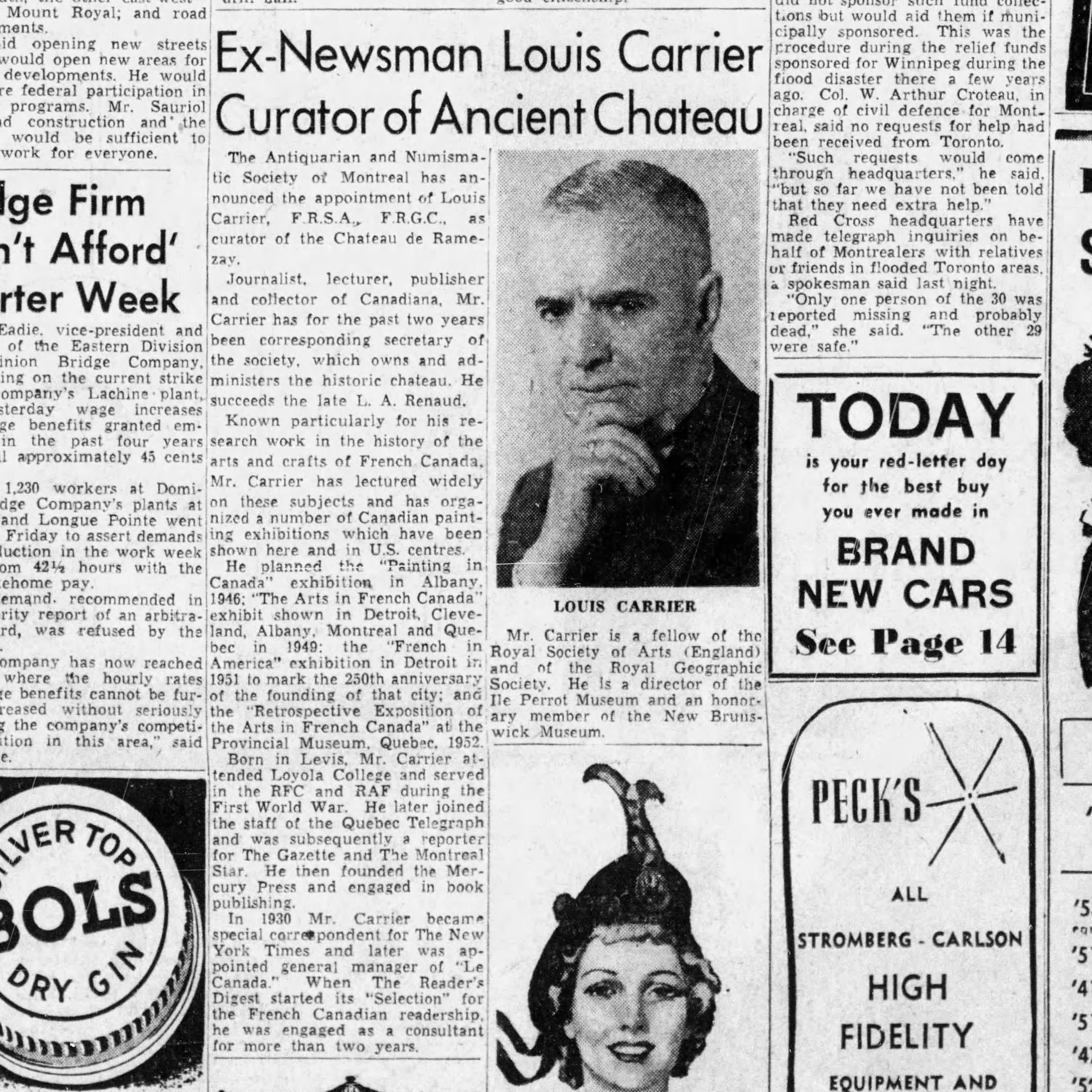 Louis Carrier becomes currator of the Cauteau Ramezay, The Gazette, Oct. 18, 1954