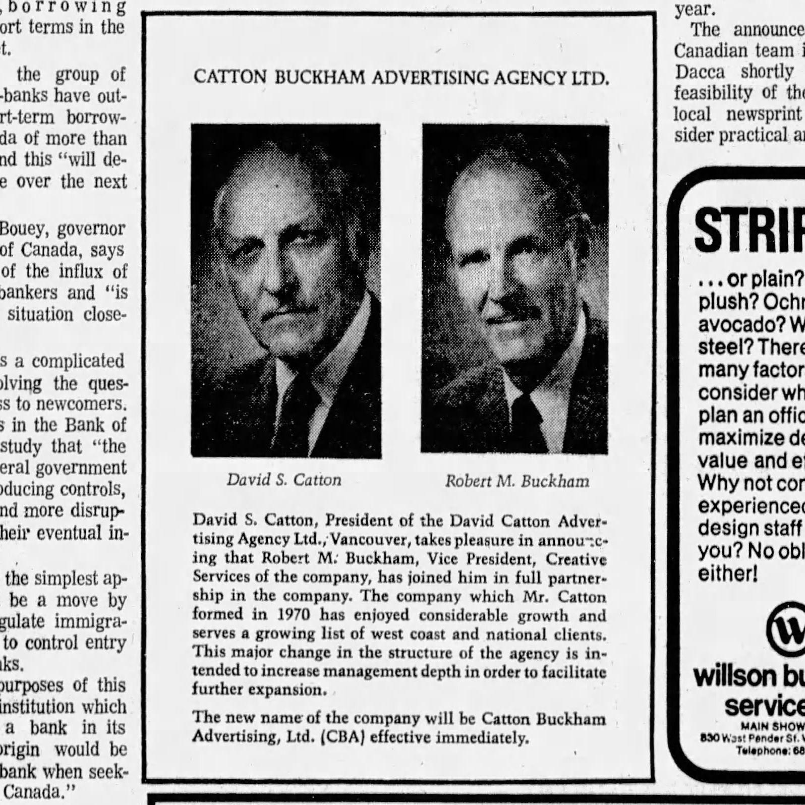Robert M. Buckham joins the David Catton Advertising Agency, The Province (Vancouver newspaper), Jun 5, 1974
