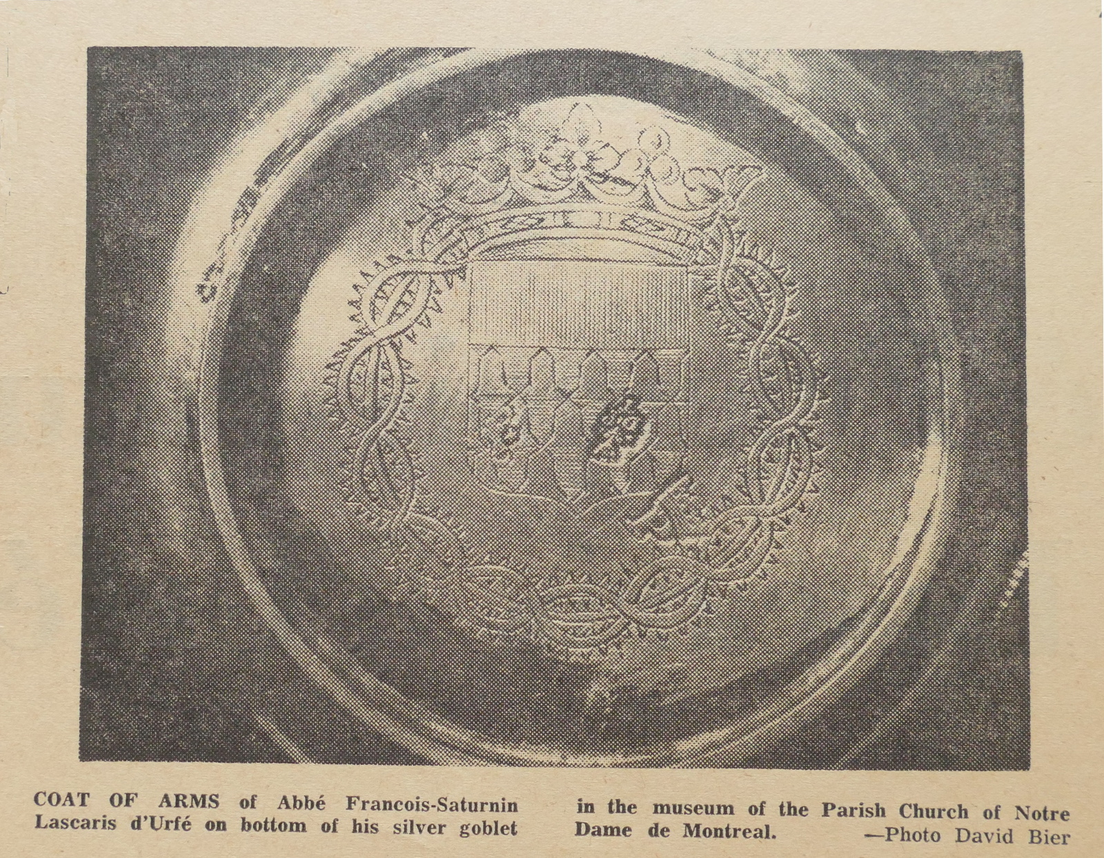 Louis Carrier of St-Anne-de-Bellevue, curator of the Chateau Ramezay in Montreal, and a friend of Thomas Lee pointed out to Tommy that the silver cup belonging to François d'Urfé was at the museum of the Notre-Dame church on Place d'Armes. When Thomas Lee went to see it, he asked to handle it. He turned the cup over and he knew he had found the coat of arms. The engraved drawing showed the D'Urfé family shield, surmounted by the crown of a marquis and surrounded by a wreath of thorns.