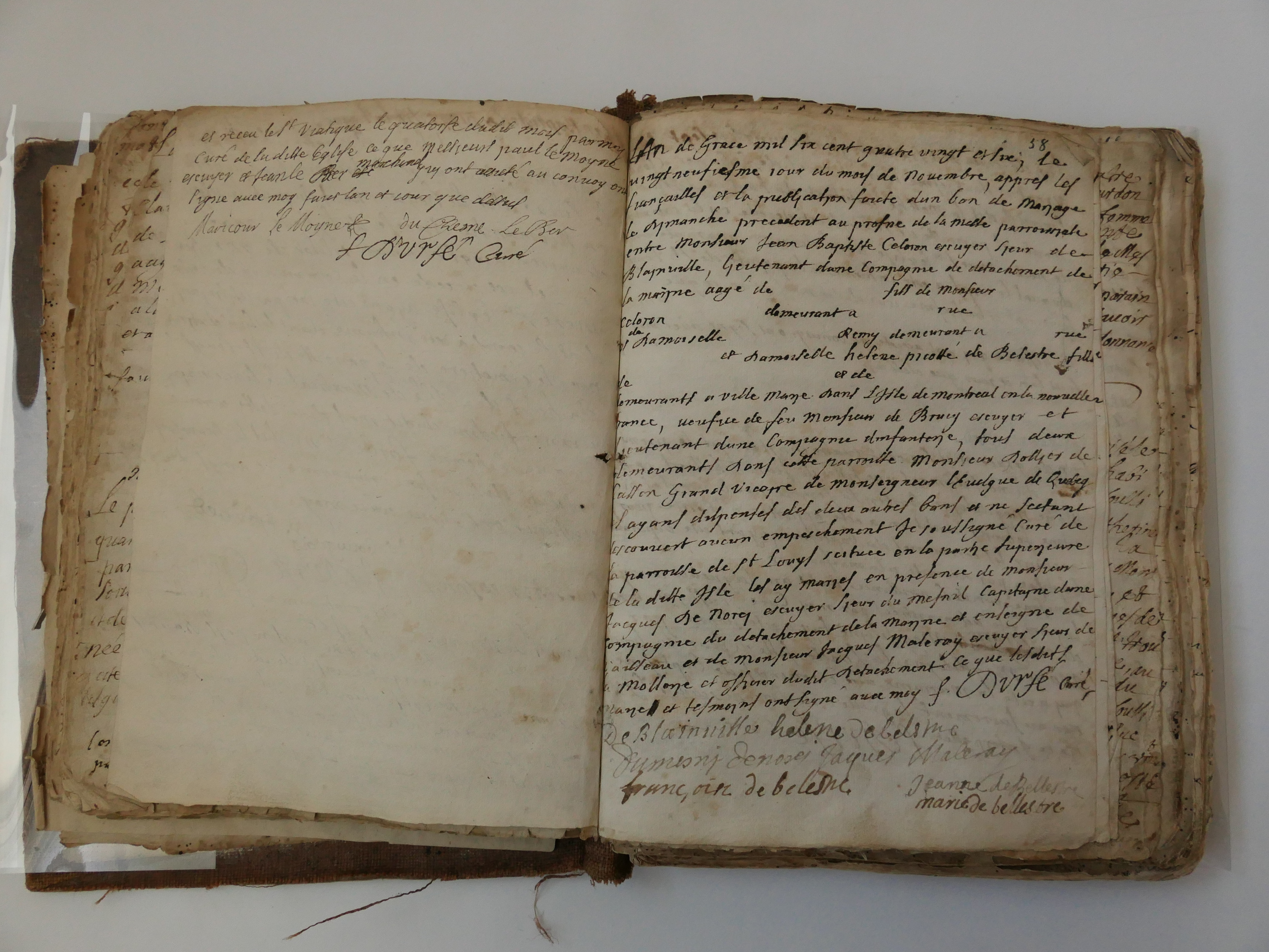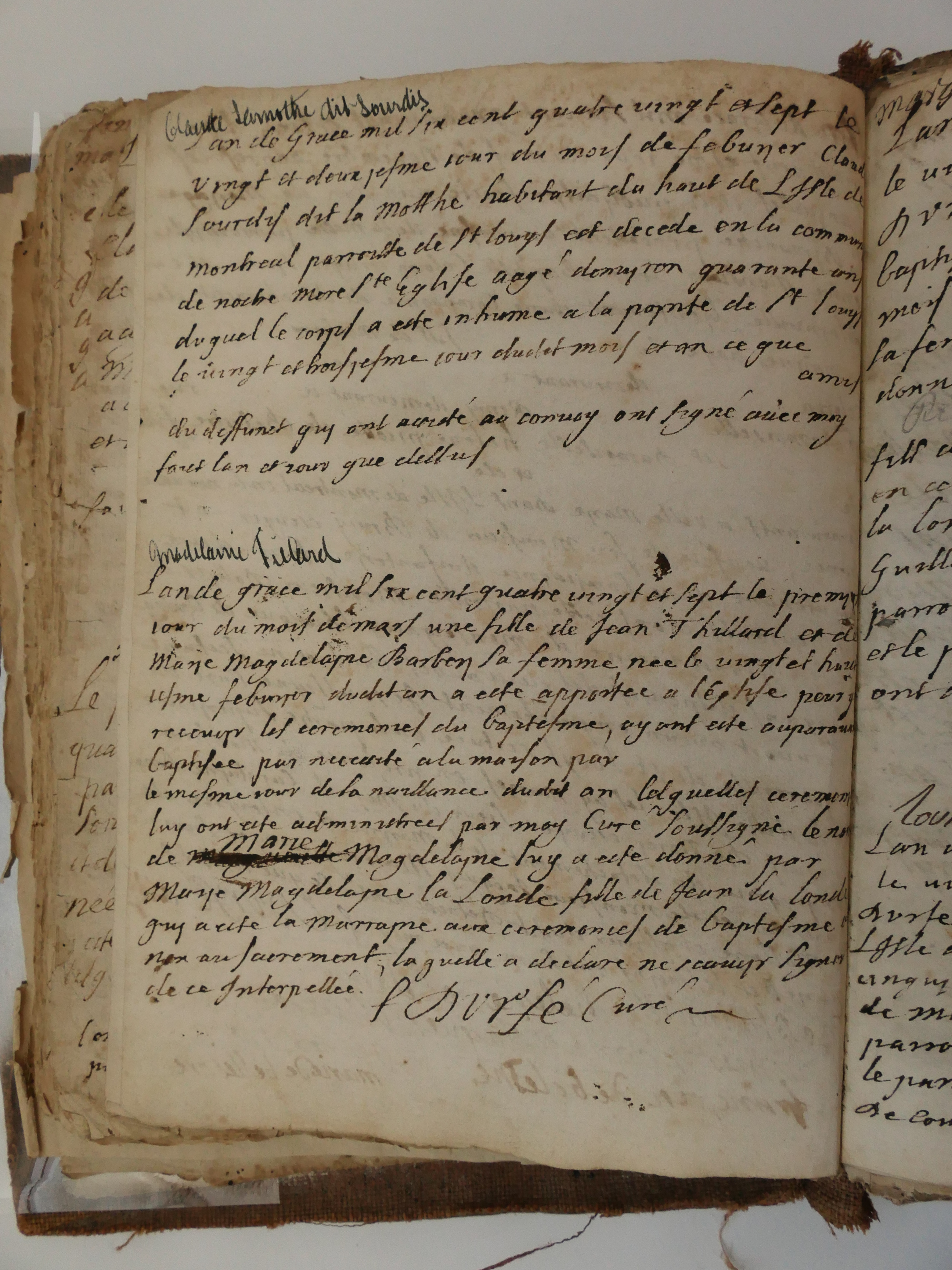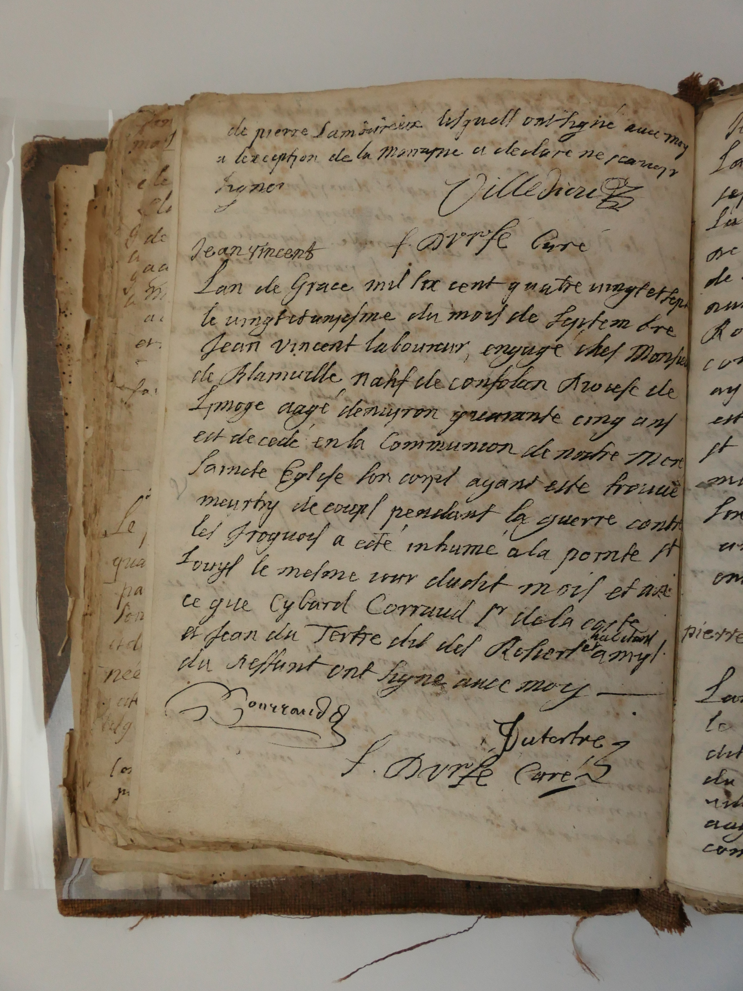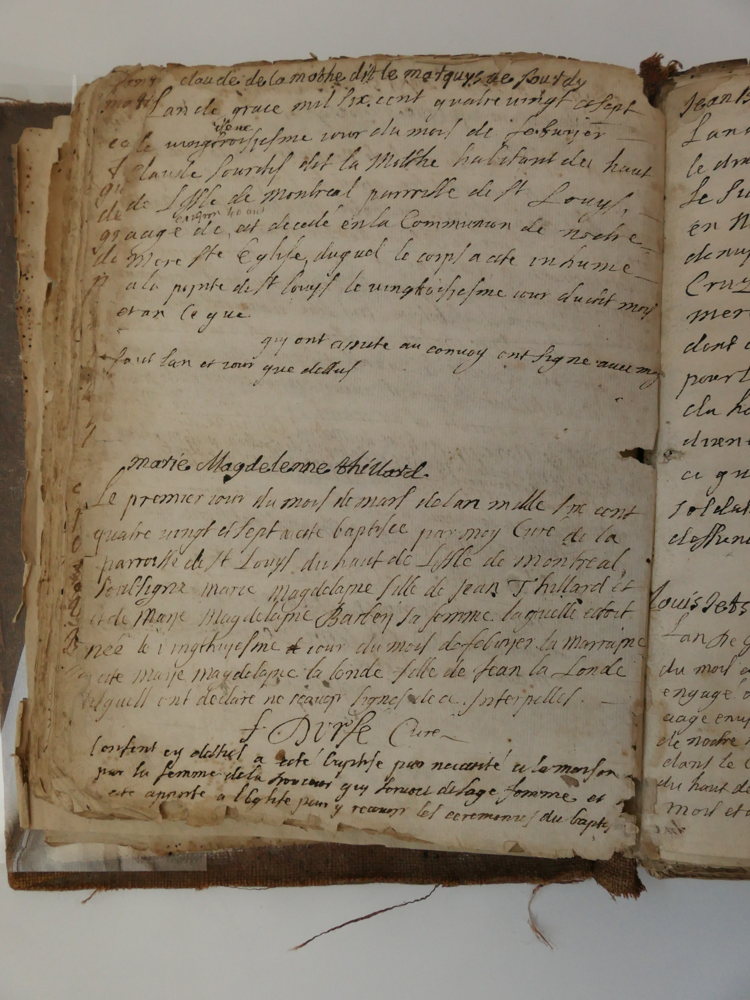 I would like to thank the Montréal Archives (BAnQ Vieux-Montréal) for helping me to locate this document and allowing me to see it. It's impressive to see those ancient pages bound into a book, an ancient church register with a cover made of cardboard and linen canvas. It is fragile but the paper is still flexible. It makes one wonder if the electronic documents that we produce today will still be readable 300 years later.