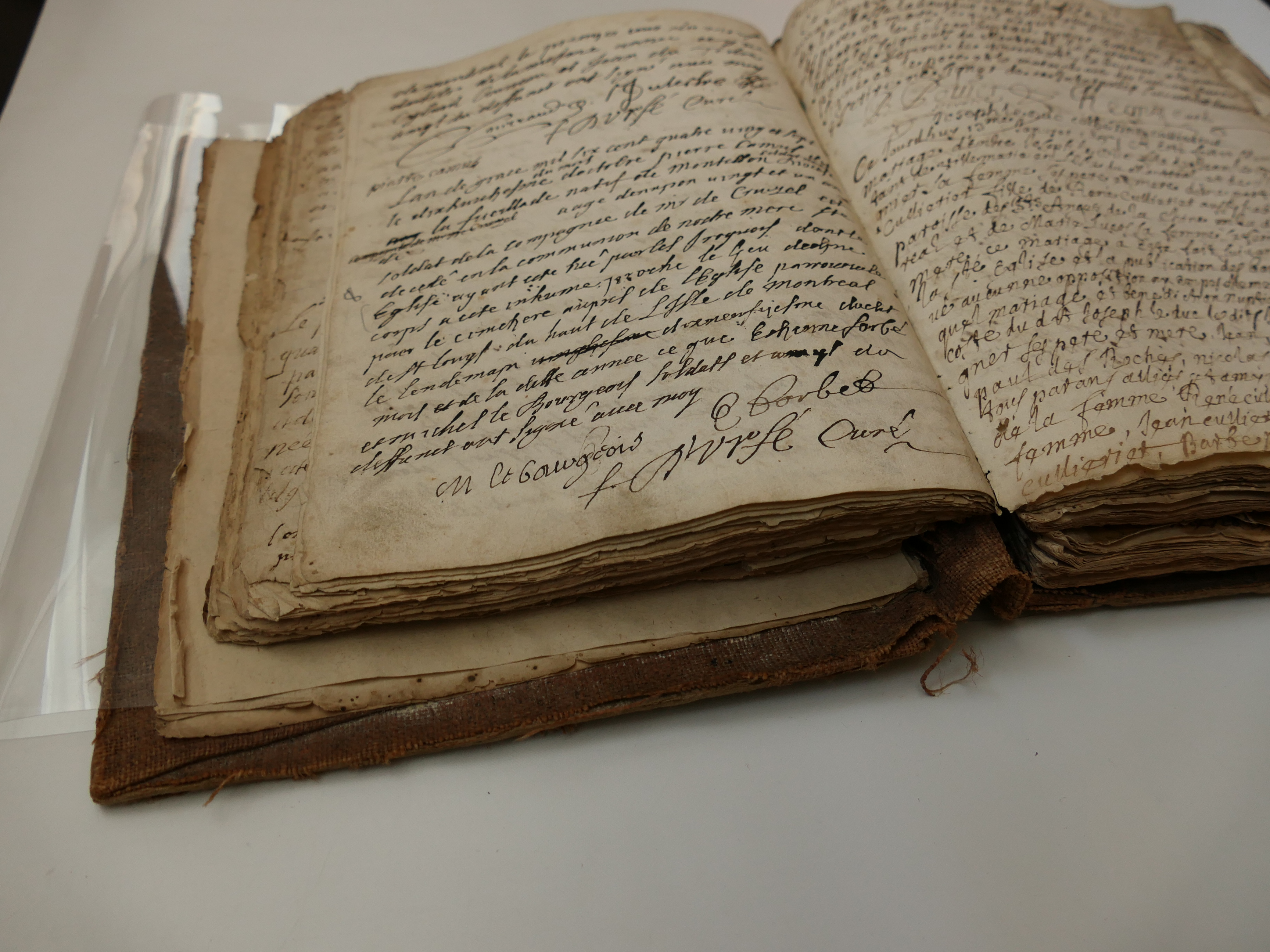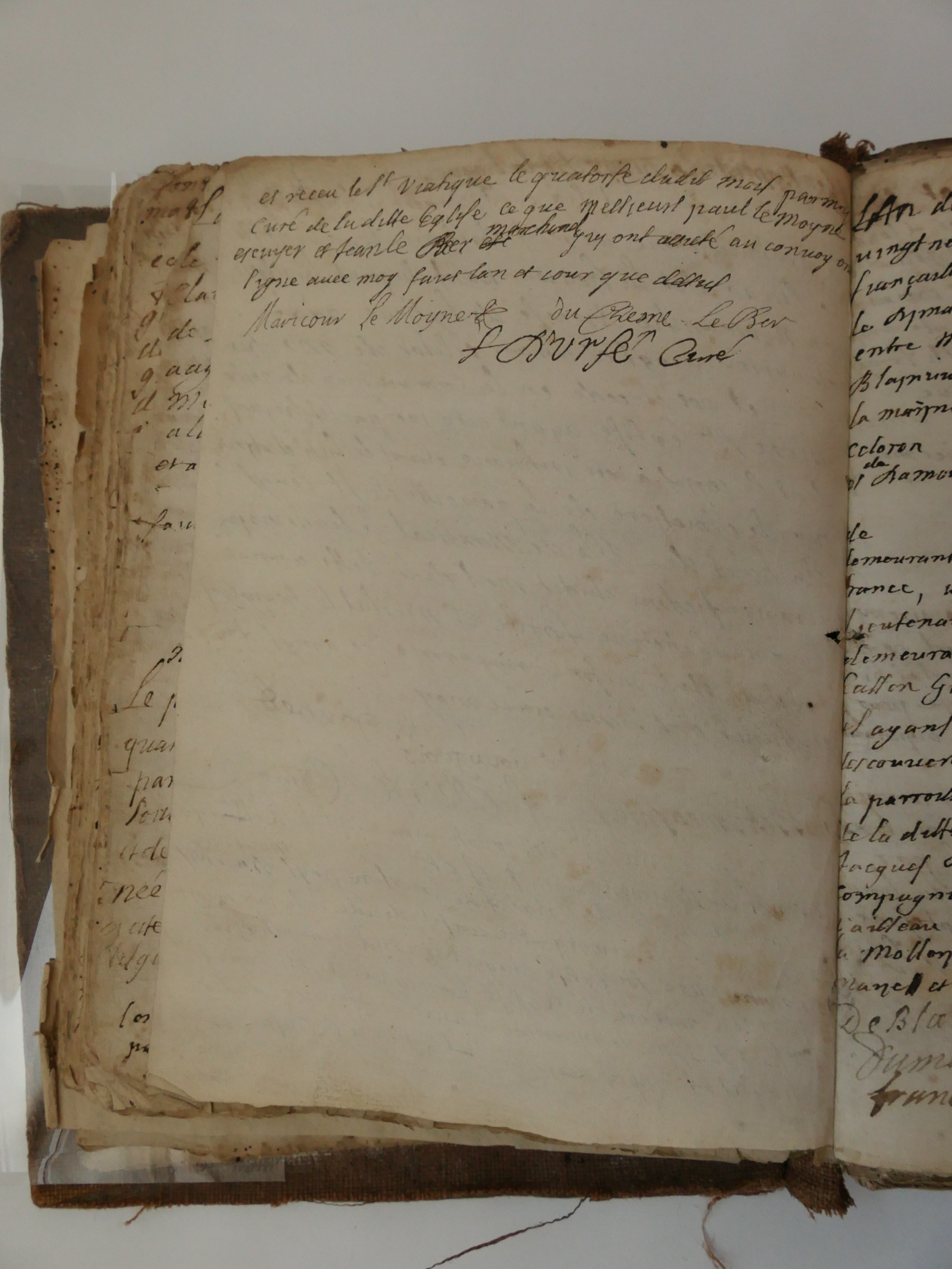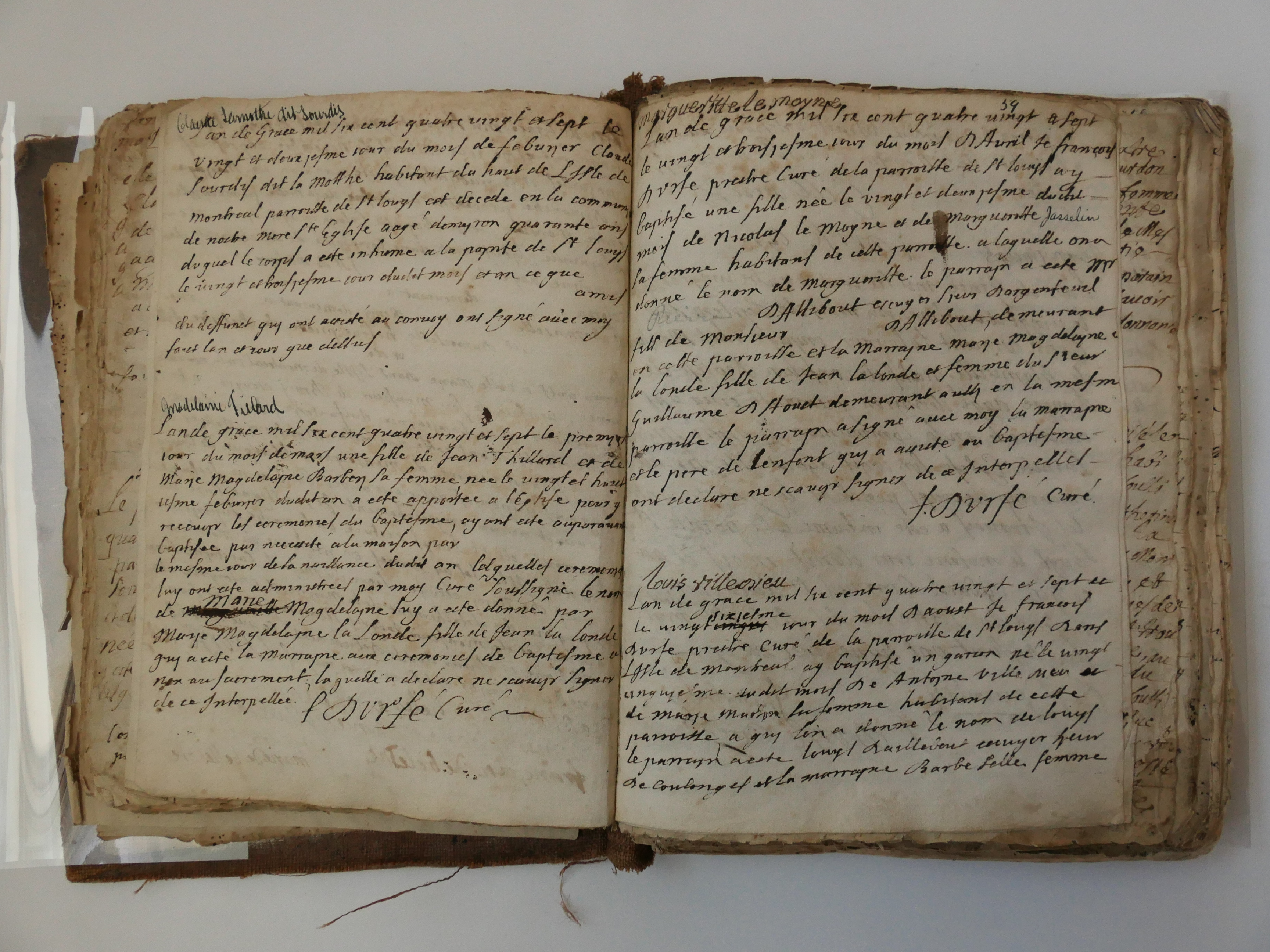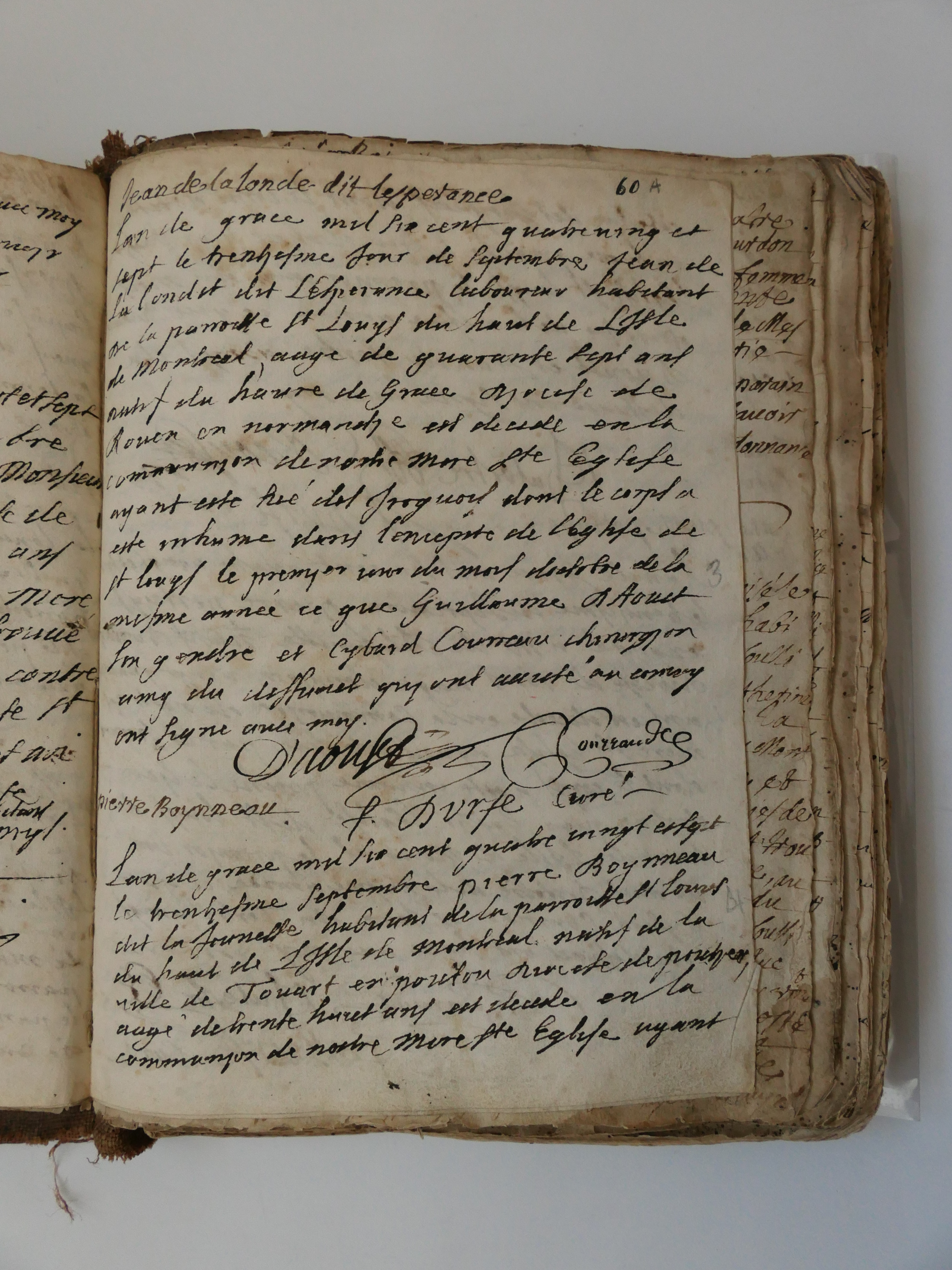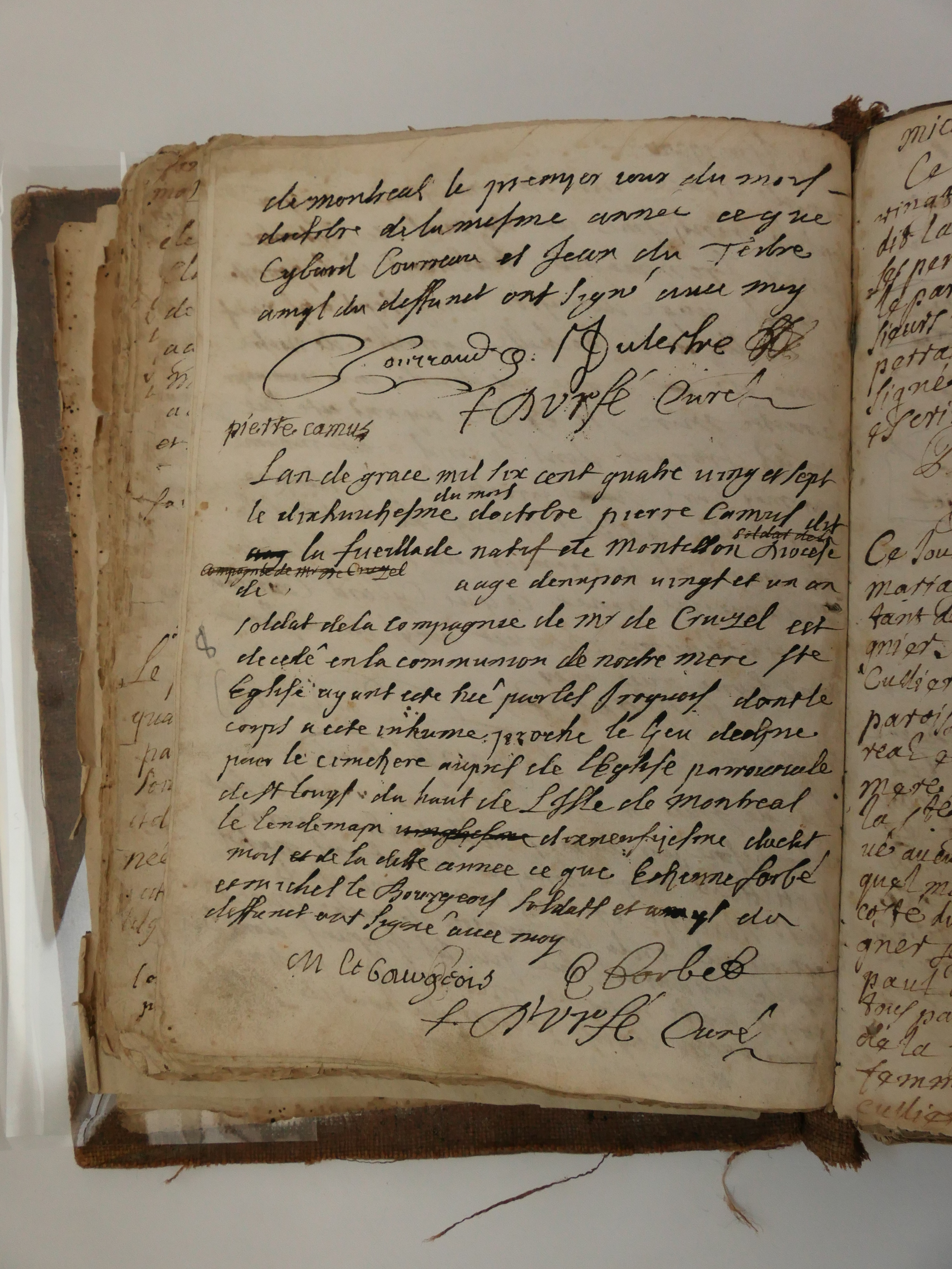 I would like to thank the Montréal Archives (BAnQ Vieux-Montréal) for helping me to locate this document and allowing me to see it. It's impressive to see those ancient pages bound into a book, an ancient church register with a cover made of cardboard and linen canvas. It is fragile but the paper is still flexible. It makes one wonder if the electronic documents that we produce today will still be readable 300 years later.