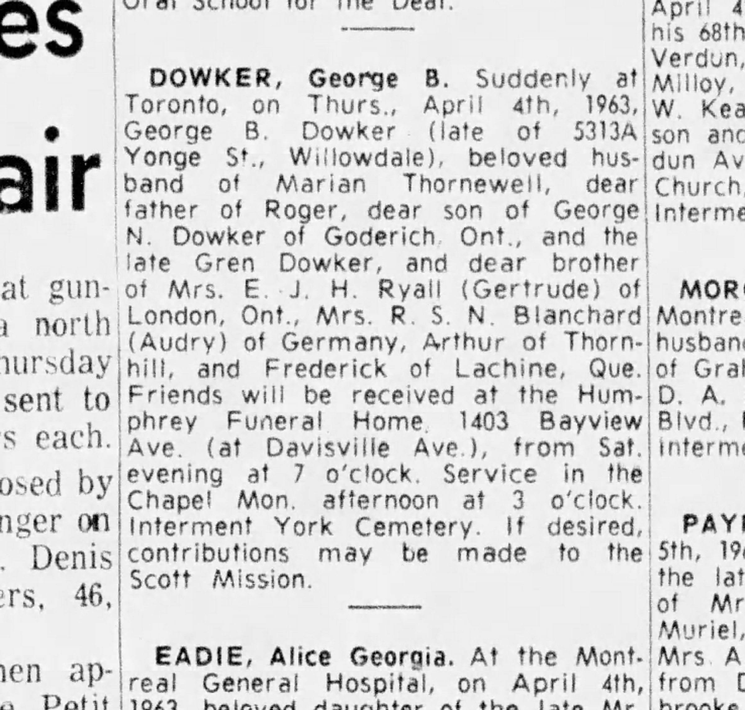 George Bagnall Dowker, source: the Gazette, Apr. 6, 1963, note: Gertrude ist listed here as wife of E.J.H. Ryall (dies later as Mrs McDonald)