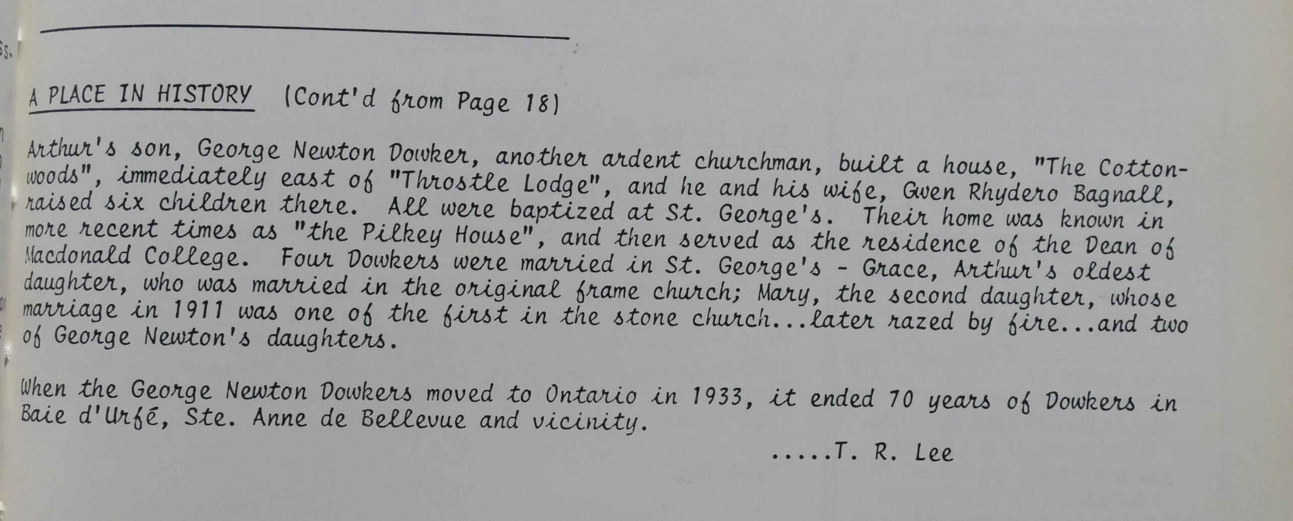 When the George Newton Dowkers moved to Ontario in 1933, it ended 70 years of Dowkers in Baie d'Urfé, Ste. Anne de Bellevue and vicinity.