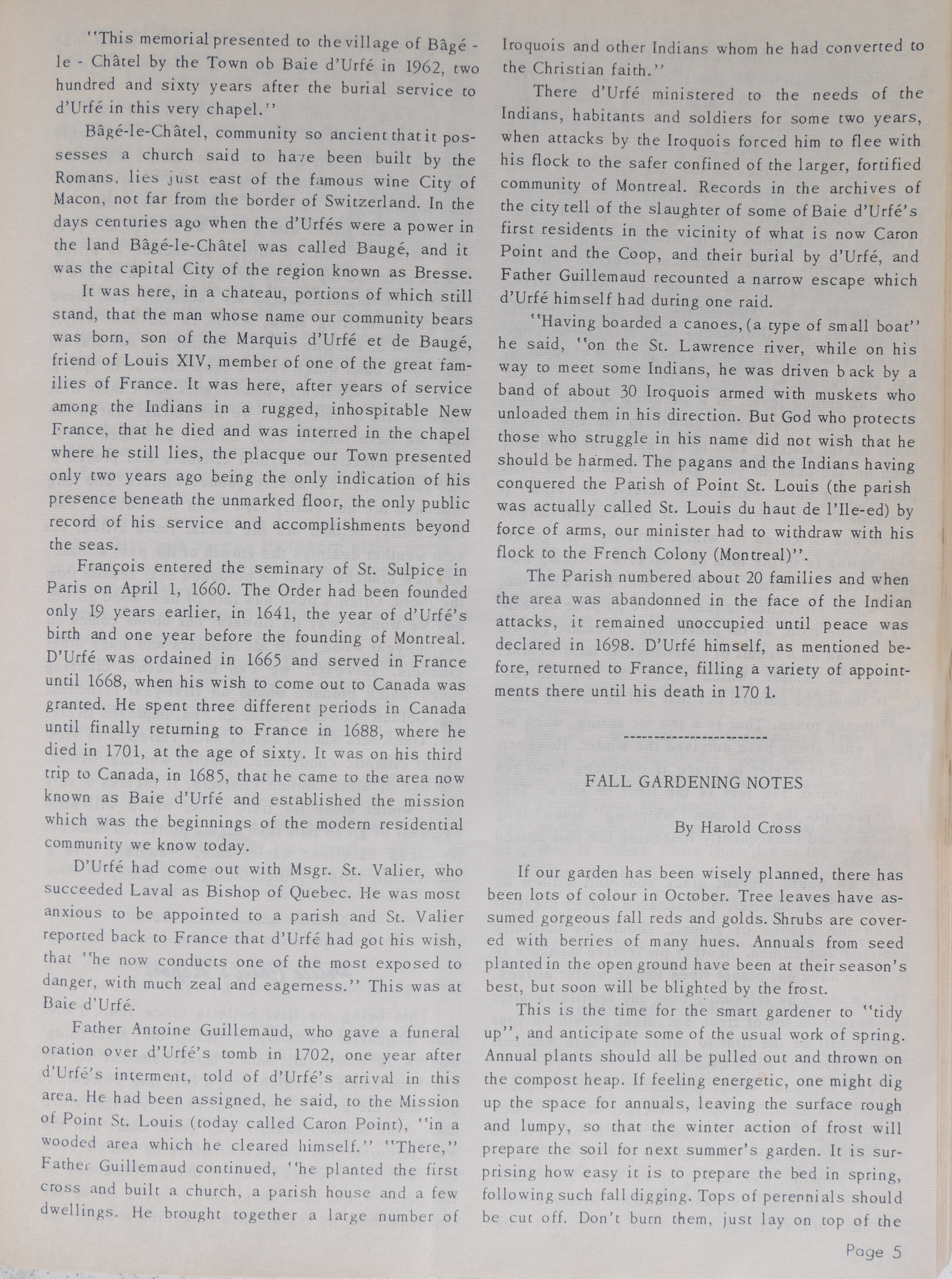 D'Urfé's mission, which was the beginning of Lou's Baie d'Urfé, stood on what is known today caron Point. The site is occupied today by the homes Mrs. Camille St. Aubin (which has been up for male since the death of Mr. St. Aubin some time ago) and of Mr. Roy Foss.