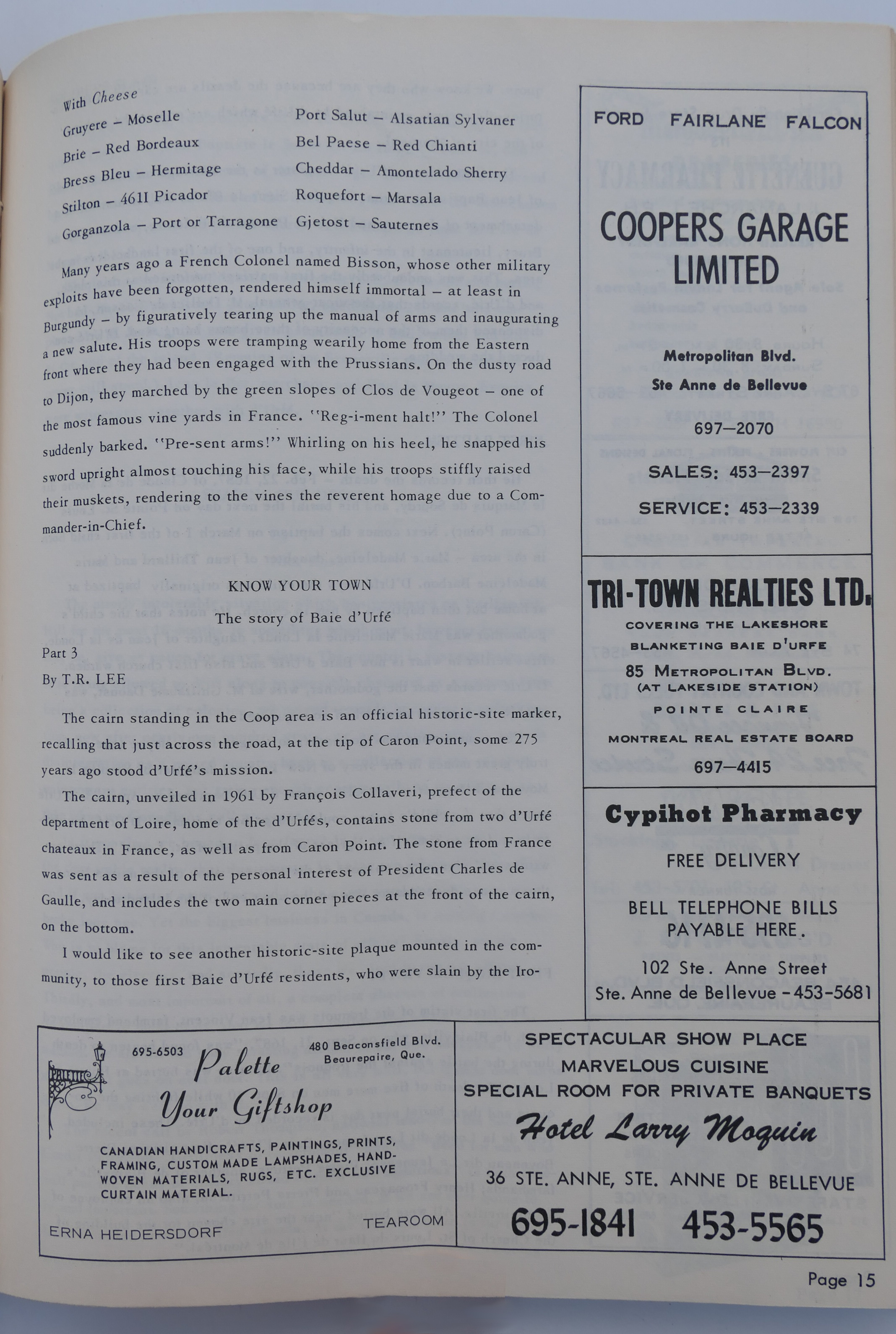 It was in 1911 that the petition or a number of residents of this area was granted and the Town of Baie d'Urfe incorporated. (By some unusual quirk, the original charter had d'Urfe spelled d'Urfee, which led to much confusion over the years. It was corrected by order-in-council some five years ago - Ed.) The incorporation was granted (Messrs Drapeau and Saulnier please note) "for the better administration of the said territory and the greater advantage of its inhabitants."