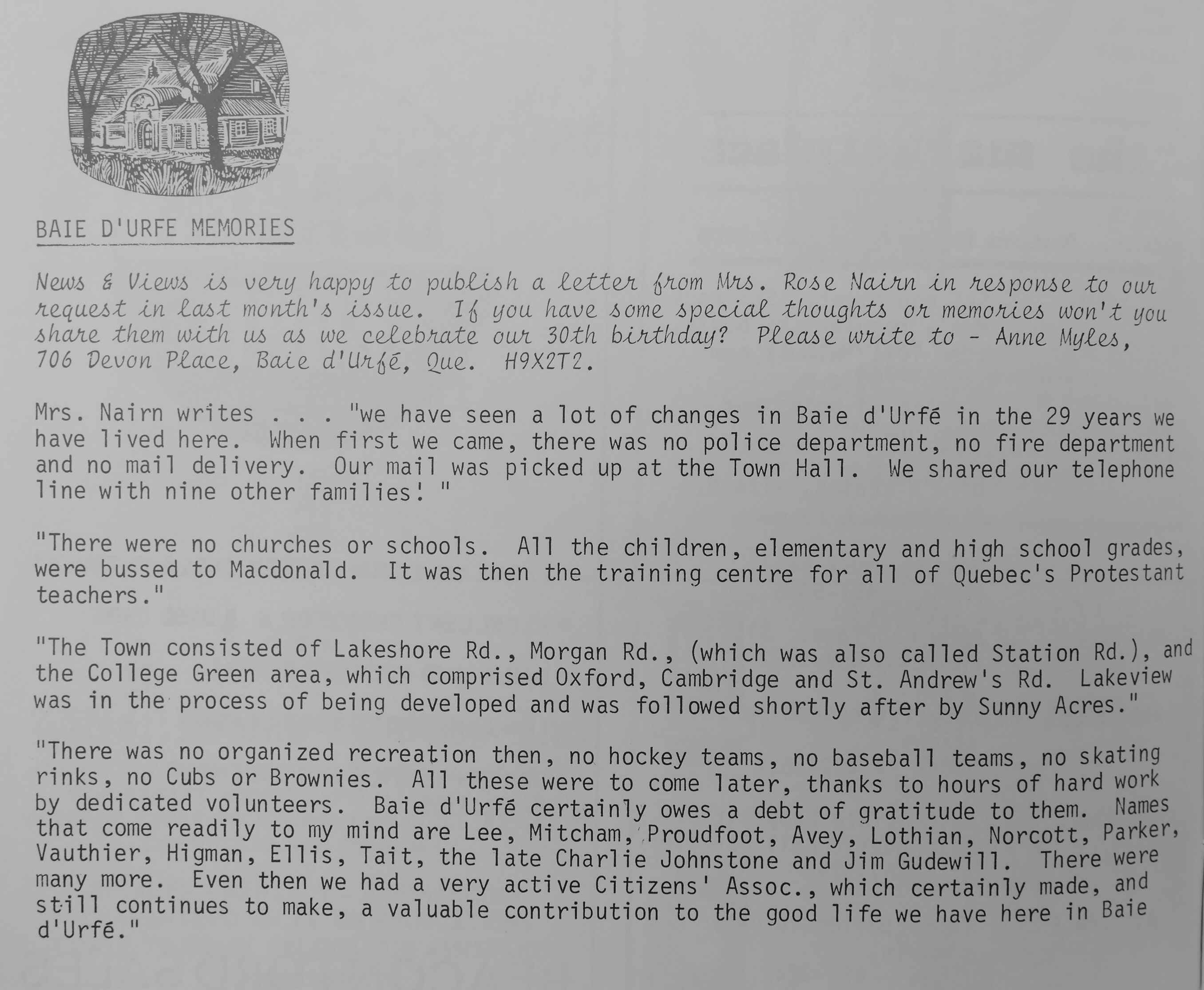 "There was no organized recreation then, no hockey teams, no baseball teams, no skating rinks, no Cubs or Brownies. All these were to come later, thanks to hours of hard wor by dedicated volunteers. Baie d'Urfé certainly owes a debt of gratitude to them. Names that come readily to my mind are Lee, Mitcham, Proudfoot, Avey, Lothian, Norcott, Parker Vauthier, Higman, Ellis, Tait, the late Charlie Johnstone and Jim Gudewill. There were many more. Even then we had a very active Citizens' Assoc., which certainly made, and still continues to make, a valuable contribution to the good life we have here in Bale d'Urfé."