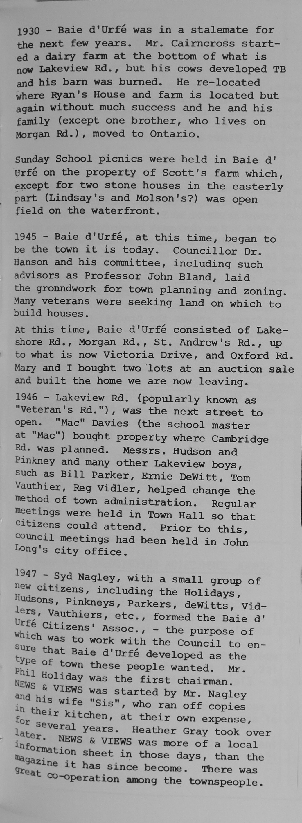 1947 - Syd Nagley, with a small group of new citizens, including the Holidays, Hudsons, Pinkneys, Parkers, deWitts, Vidlers, Vauthiers, etc., formed the Baie d'Urfé Citizens' Assoc., - the purpose of which was to work with the Council to ensure that Baie d'Urfé developed as the type of town these people wanted. Mr. Phil Holiday was the first chairman. NEWS & VIEWS was started by Mr. Nagley and his wife "Sis", who ran off copies in their kitchen, at their own expense, for several years. Heather Gray took over later. The NEWS & VIEWS was more of a local information sheet in those days, than the magazine it has since become. There was great co-operation among the townspeople.