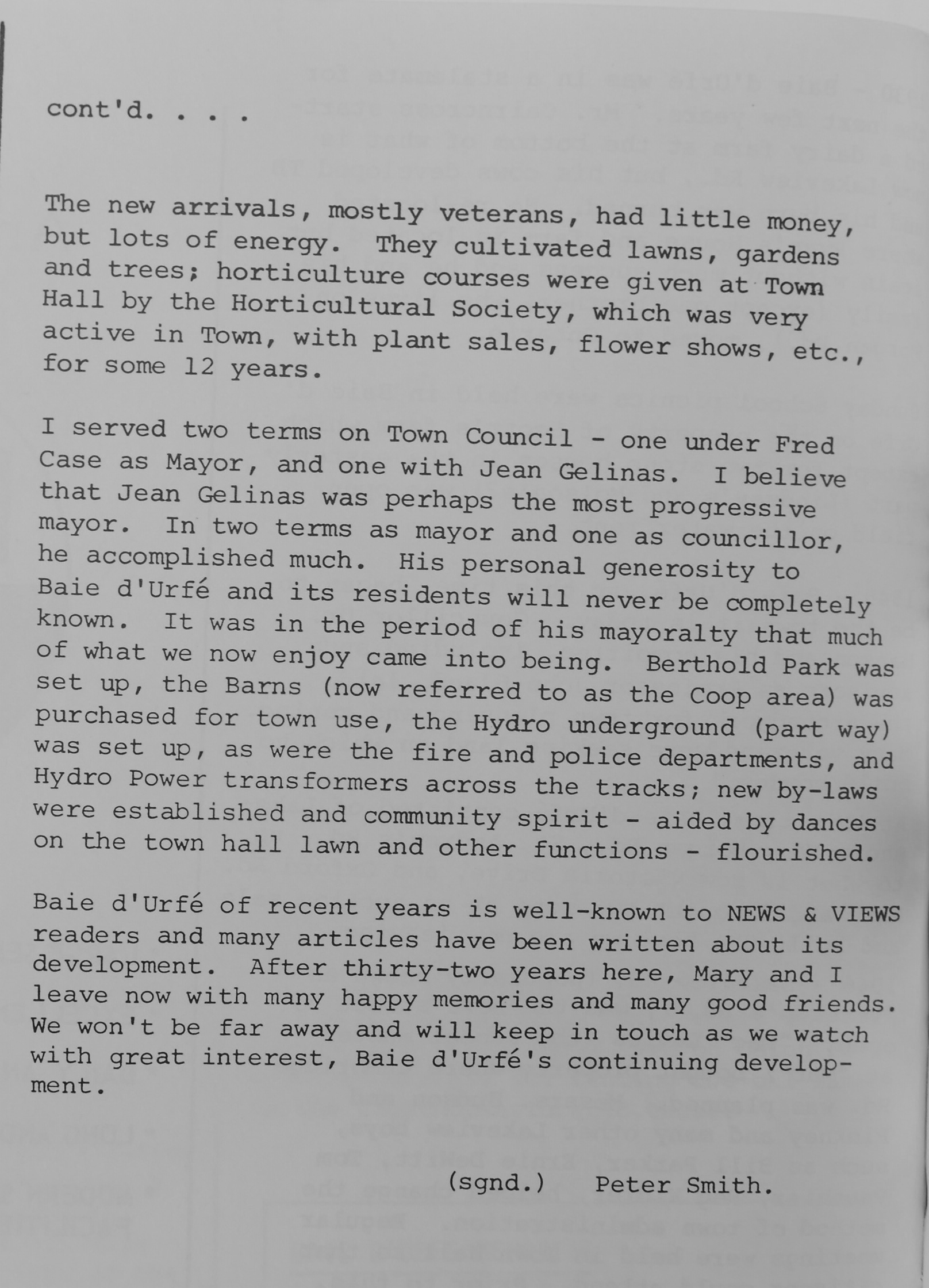I served two terms on Town Council - one under Fred Case as Mayor, and one with Jean Gelinas. I believe that Jean Gelinas was perhaps the most progressive mayor. In two terms as mayor and one as councillor, he accomplished much. His personal generosity to Baie d'Urfé and its residents will never be completely known. It was in the period of his mayoralty that much of what we now enjoy came into being. Berthold Park was set up, the Barns (now referred to as the Coop area) was purchased for town use, the Hydro underground (part way) was set up, as were the fire and police departments, and Hydro Power transformers across the tracks; new by-laws were established and community spirit - aided by dances on the town hall lawn and other functions - flourished.