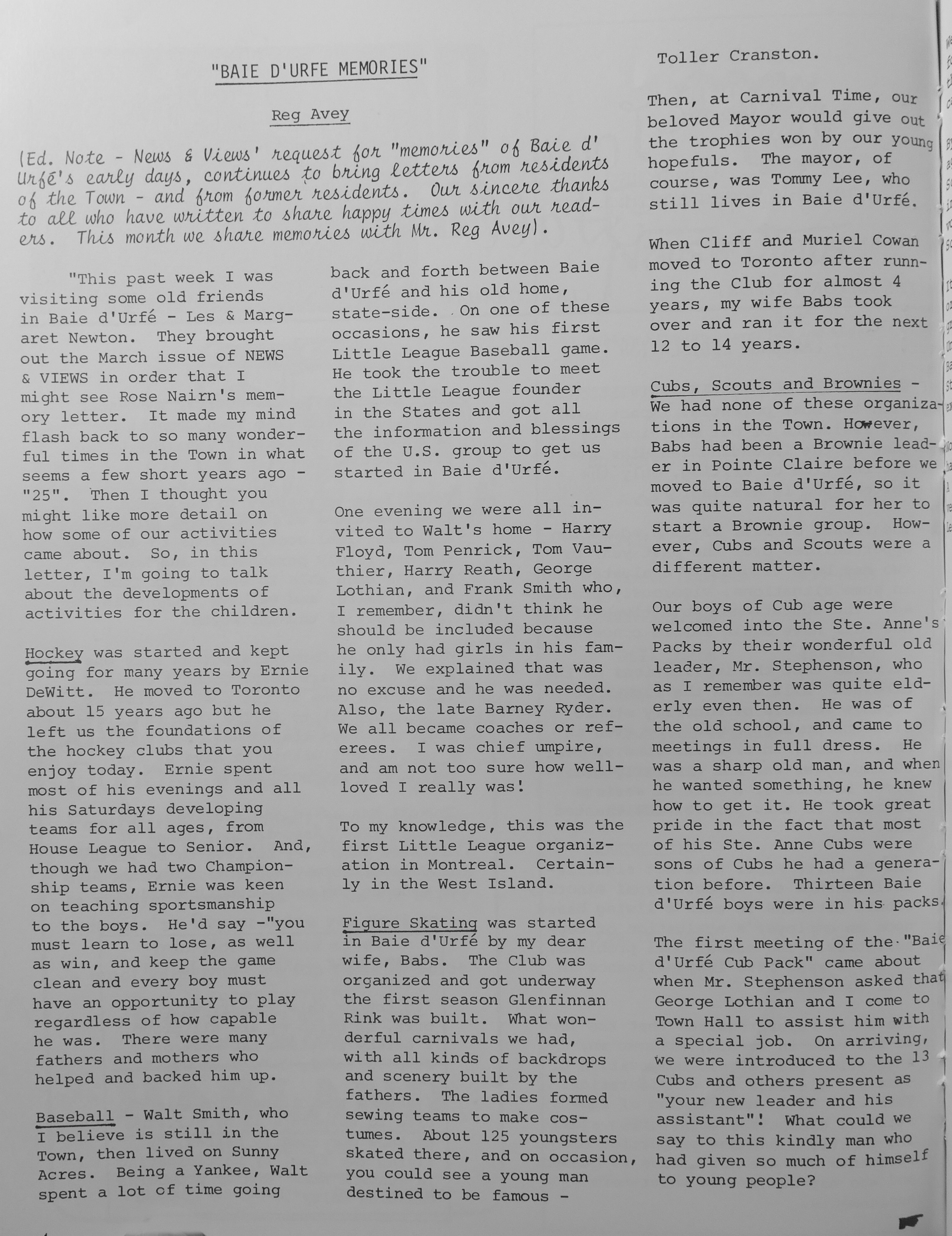 Ed. Note - News & Views' request for "memories" of Baie d' Urfé's early days, continues to bring letters from residents of the Town - and from former residents. Our sincere thanks to all who have written to share happy times with our readers. This month we share memories with Mr. Reg Avey.
