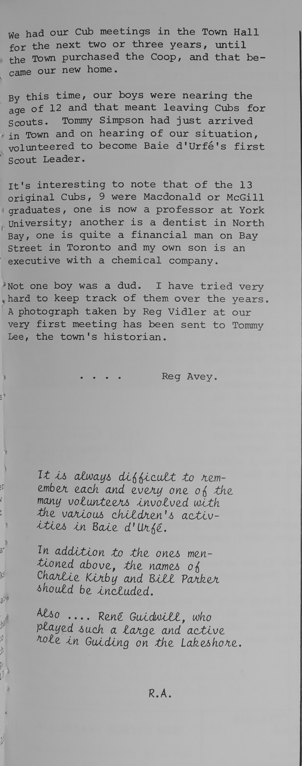 By this time, our boys were nearing the age of 12 and that meant leaving Cubs for Scouts. Tommy Simpson had just arrived in Town and on hearing of our situation, volunteered to become Baie d'Urfe's first Scout Leader.