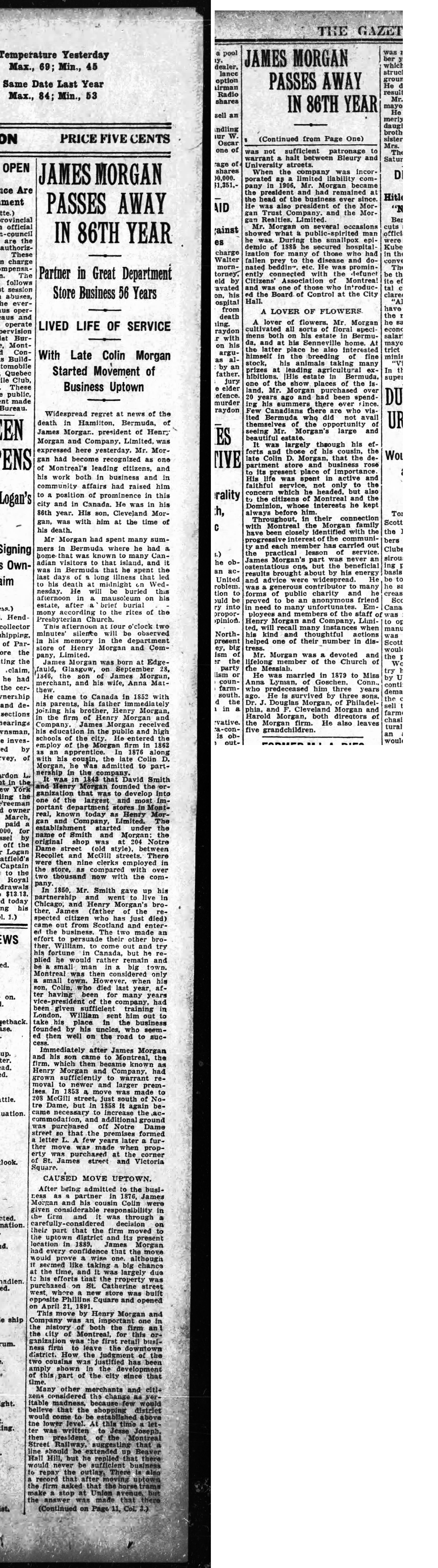 James Morgan passes away in 86th year, the Gazette, Friday, May 20, 1932