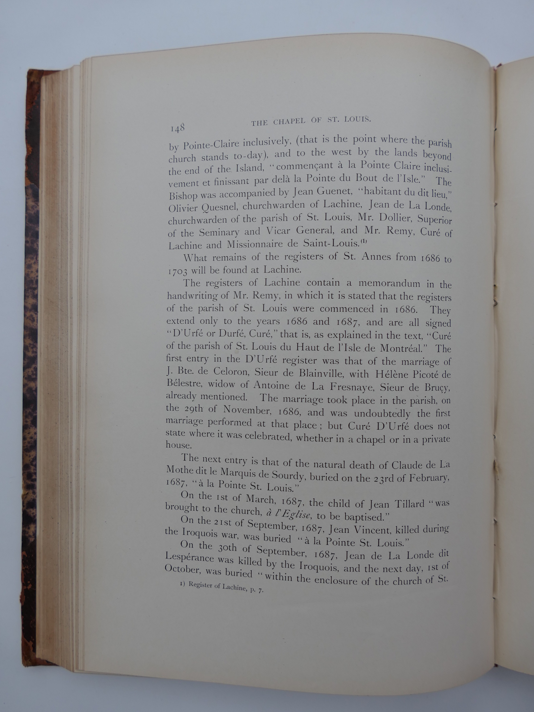 The registers of Lachine contain a memorandum in the handwriting of Mr. Remy, in which it is stated that the registers of the parish of St. Louis were commenced in 1686. They extend only to the years 1686 and 1687, and are all signed "D'Urfé or Durfé, Curé," that is, as explained in the text, "Curé of the parish of St. Louis du Haut de l'Isle de Montréal." The first entry in the D'Urfé register was that of the marriage of J. Bte. de Celoron, Sieur de Blainville, with Hélène Picoté de Bèlestre, widow of Antoine de La Fresnaye, Sieur de Bruçy, already mentioned. The marriage took place in the parish, on the 29th of November, 1686, and was undoubtedly the first marriage performed at that place; but Curé D'Urfé does not state where it was celebrated, whether in a chapel or in a private house.