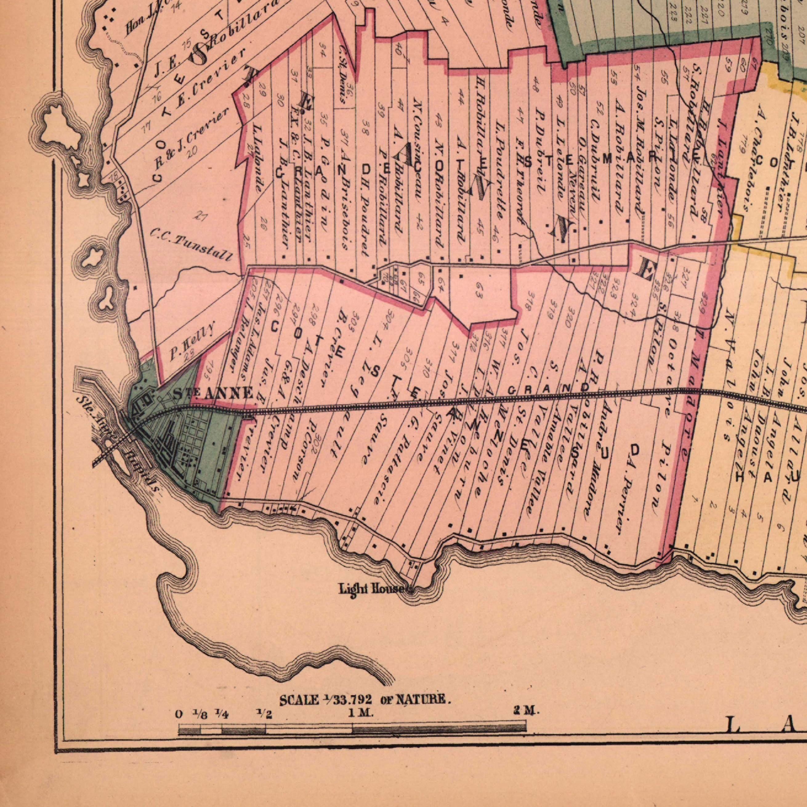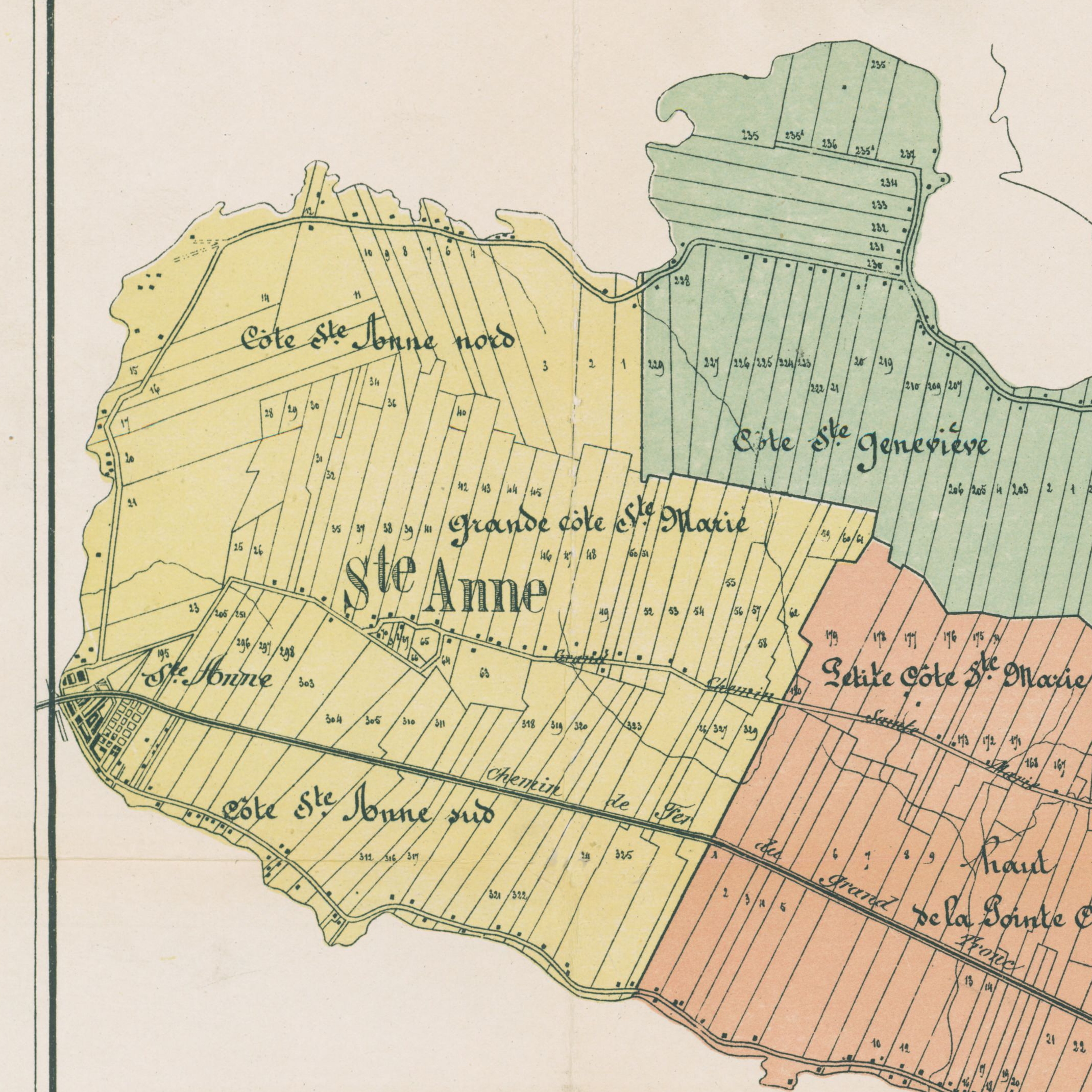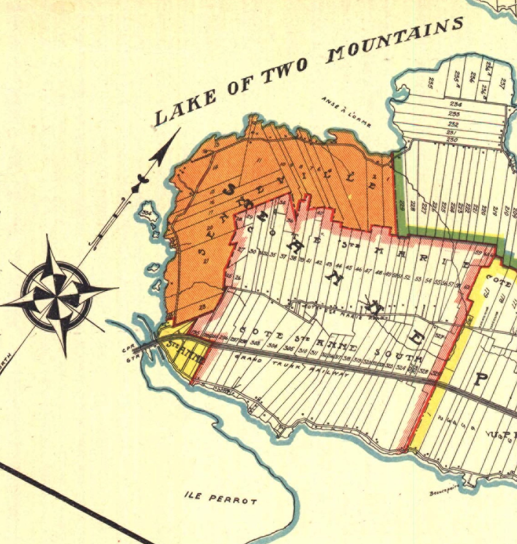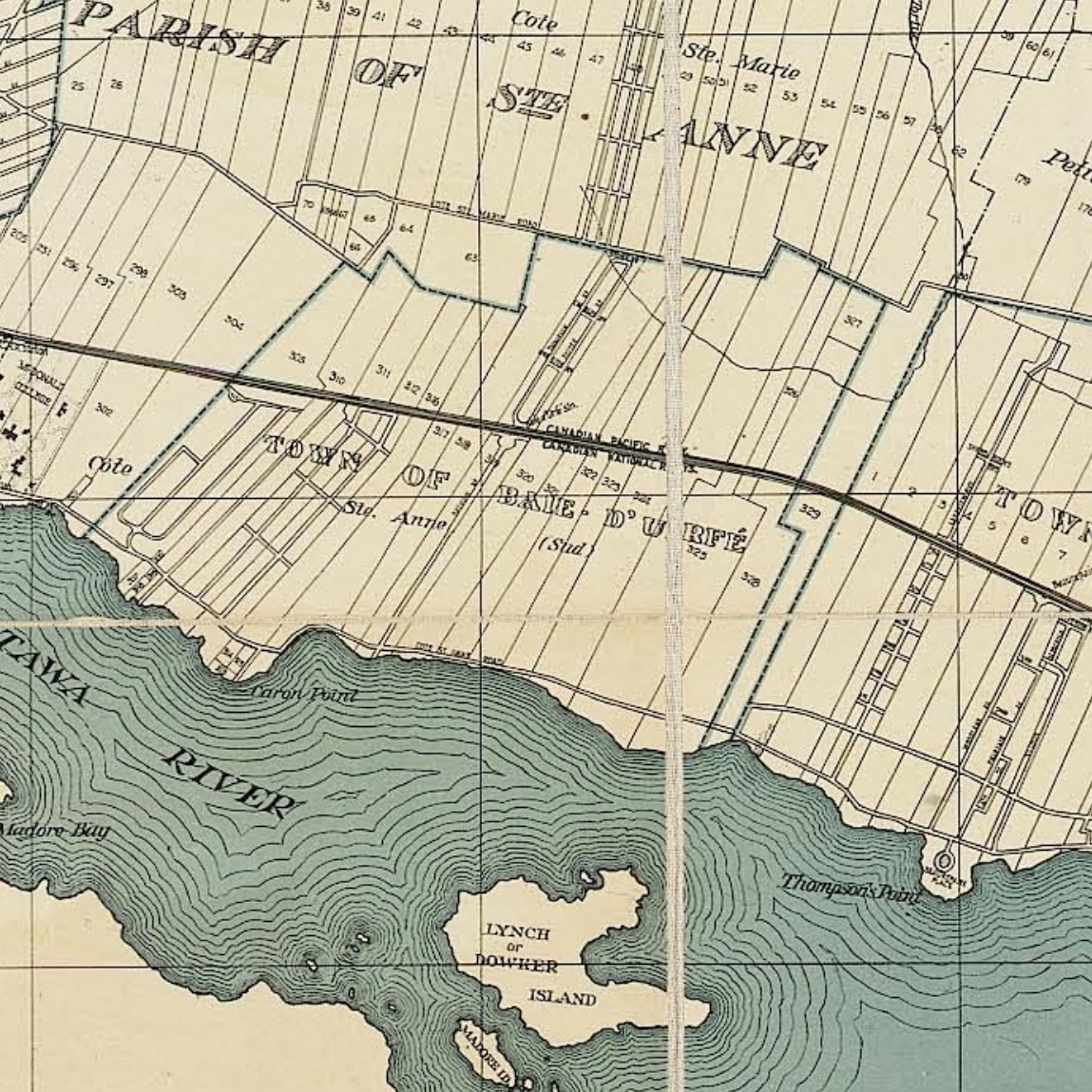 The Baie-D'Urfé farms where towel shaped lots running from about St-Marie Road in the north down south to the water.