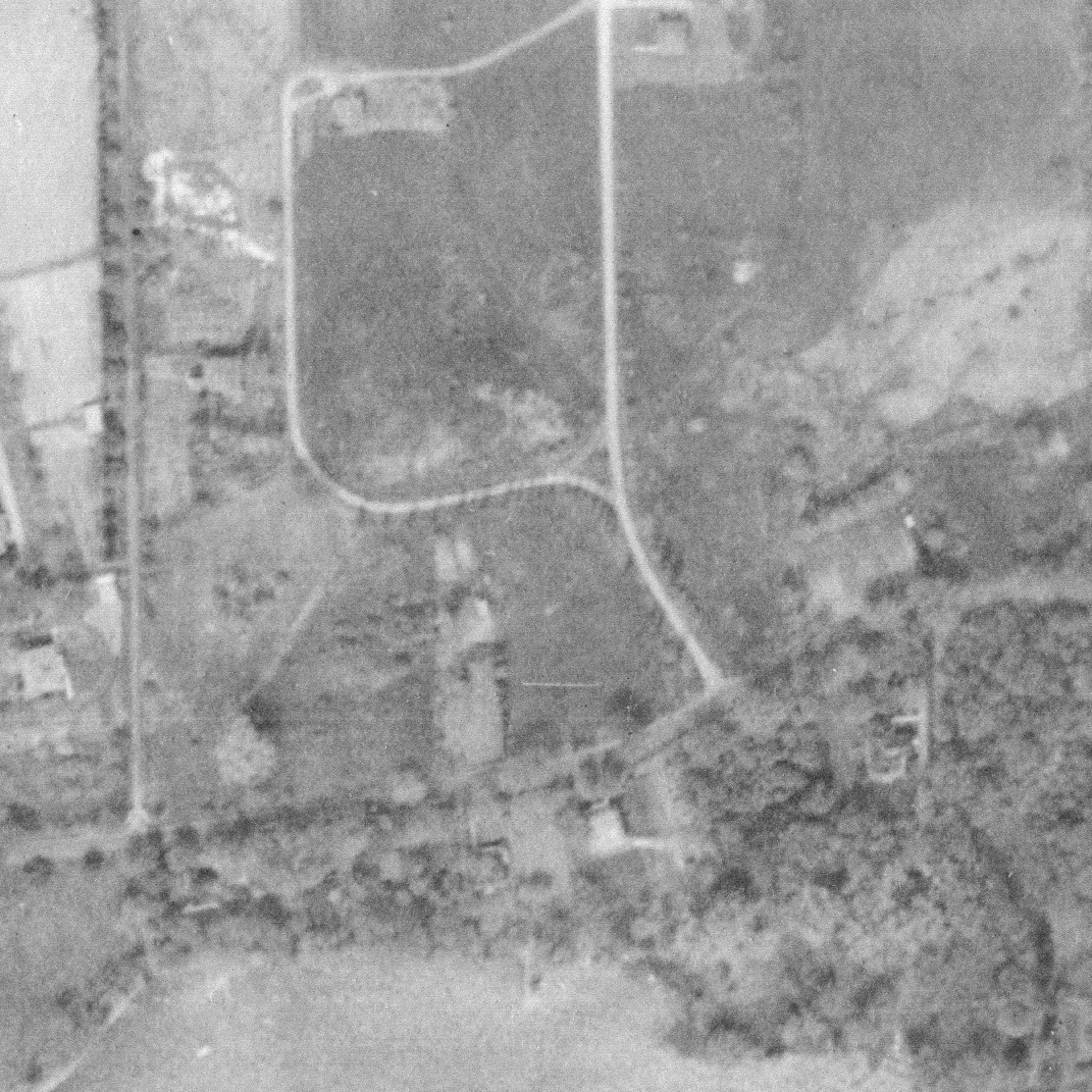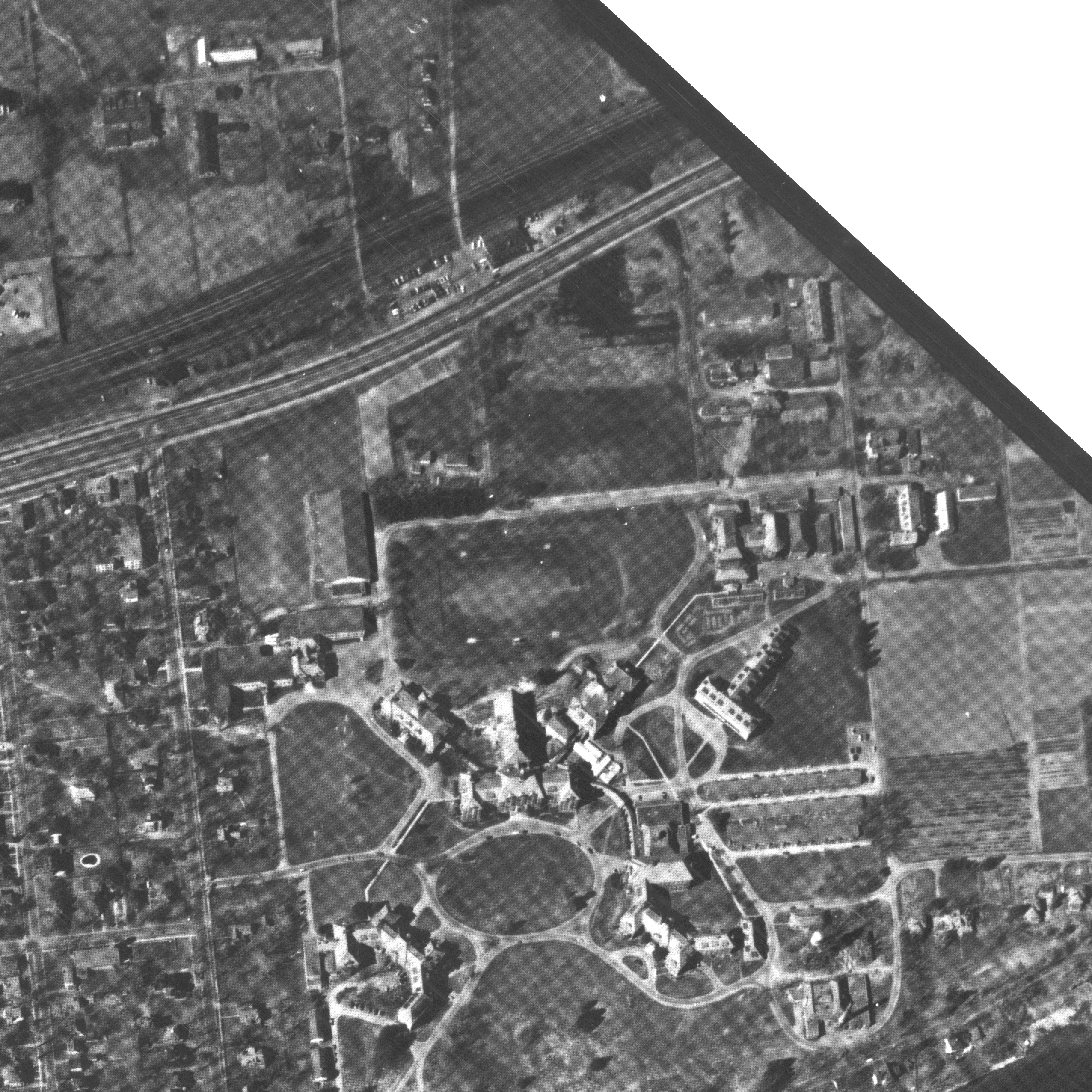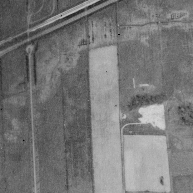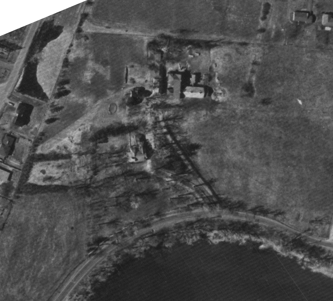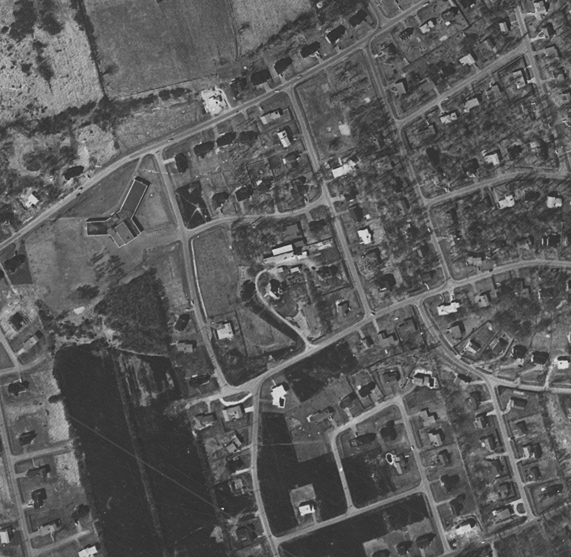 Photo of the town entrance from May 14, 1930, Station Road with turning circle near railway tracks, source: The National Air Photo Library - Natural Resources Canada