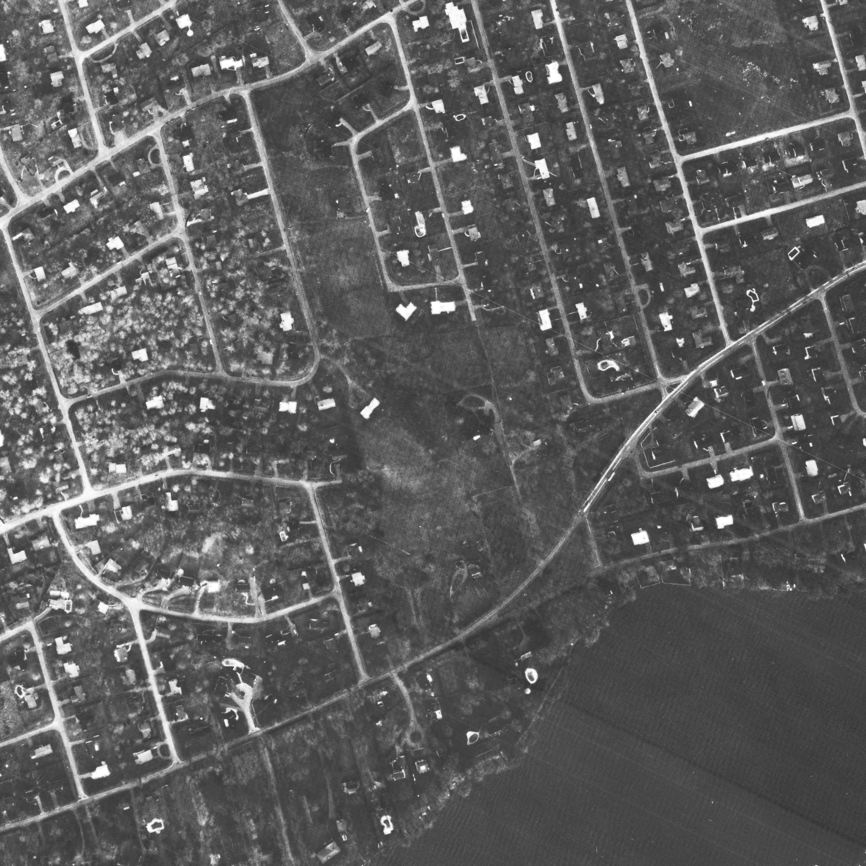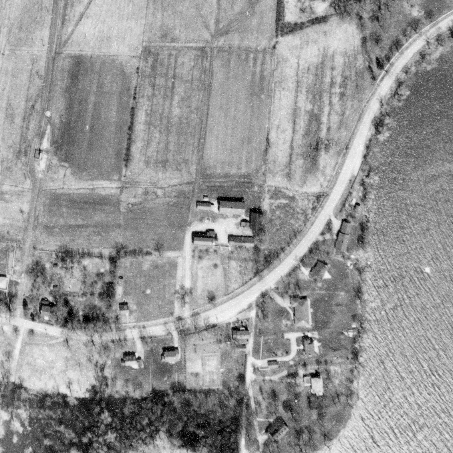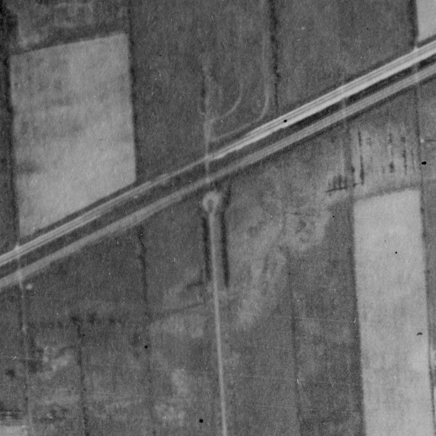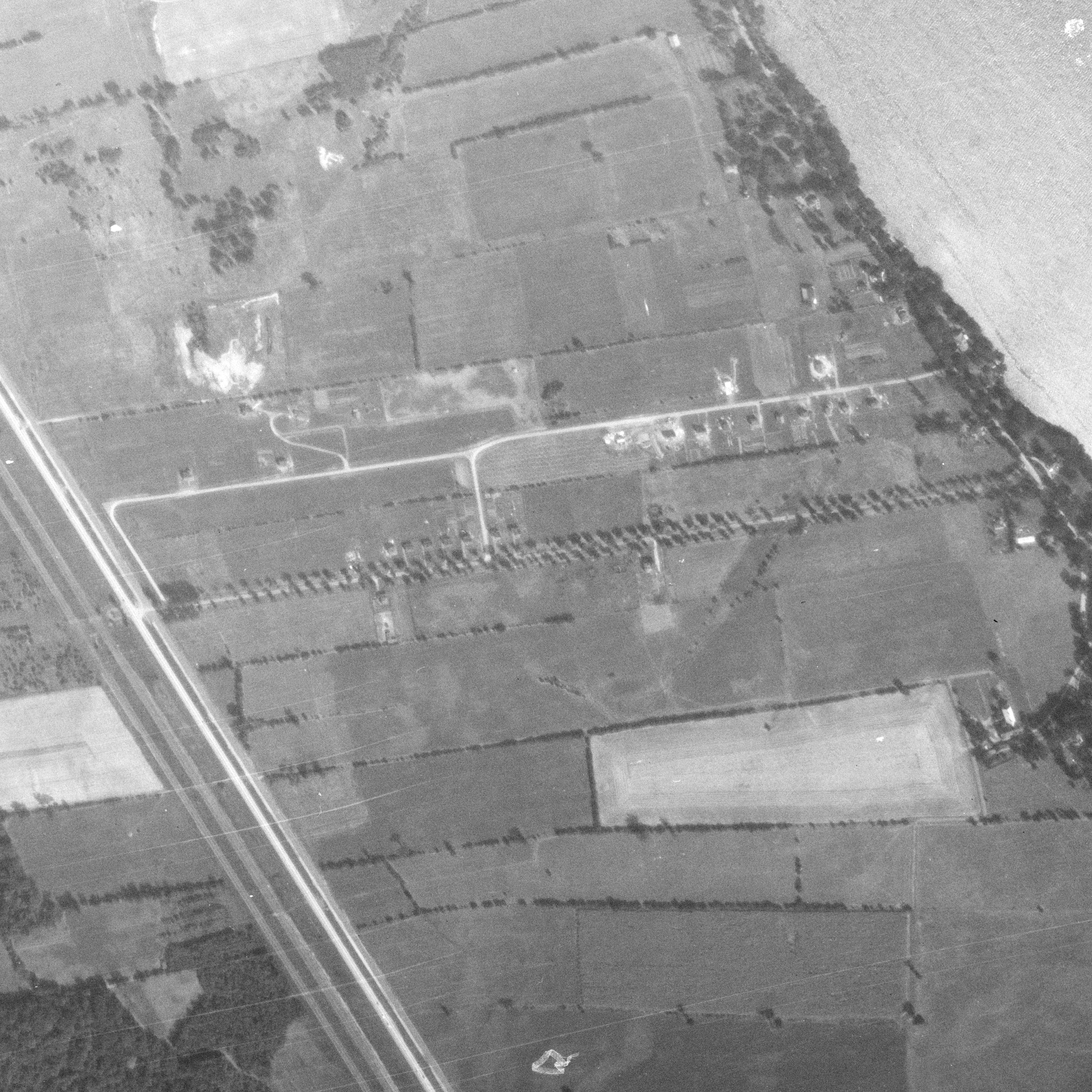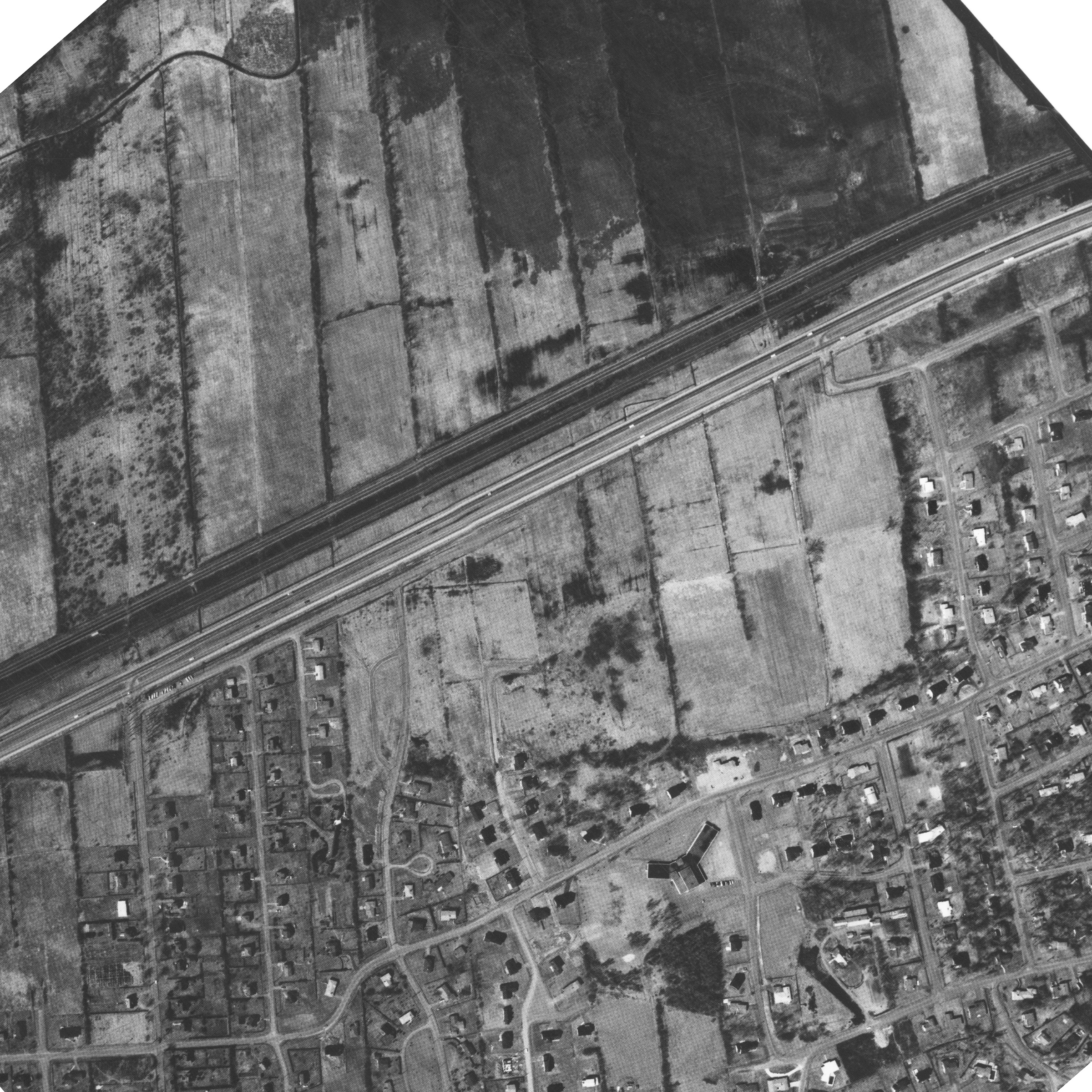 Photo of the town entrance from May 14, 1930, Station Road with turning circle near railway tracks, source: The National Air Photo Library - Natural Resources Canada