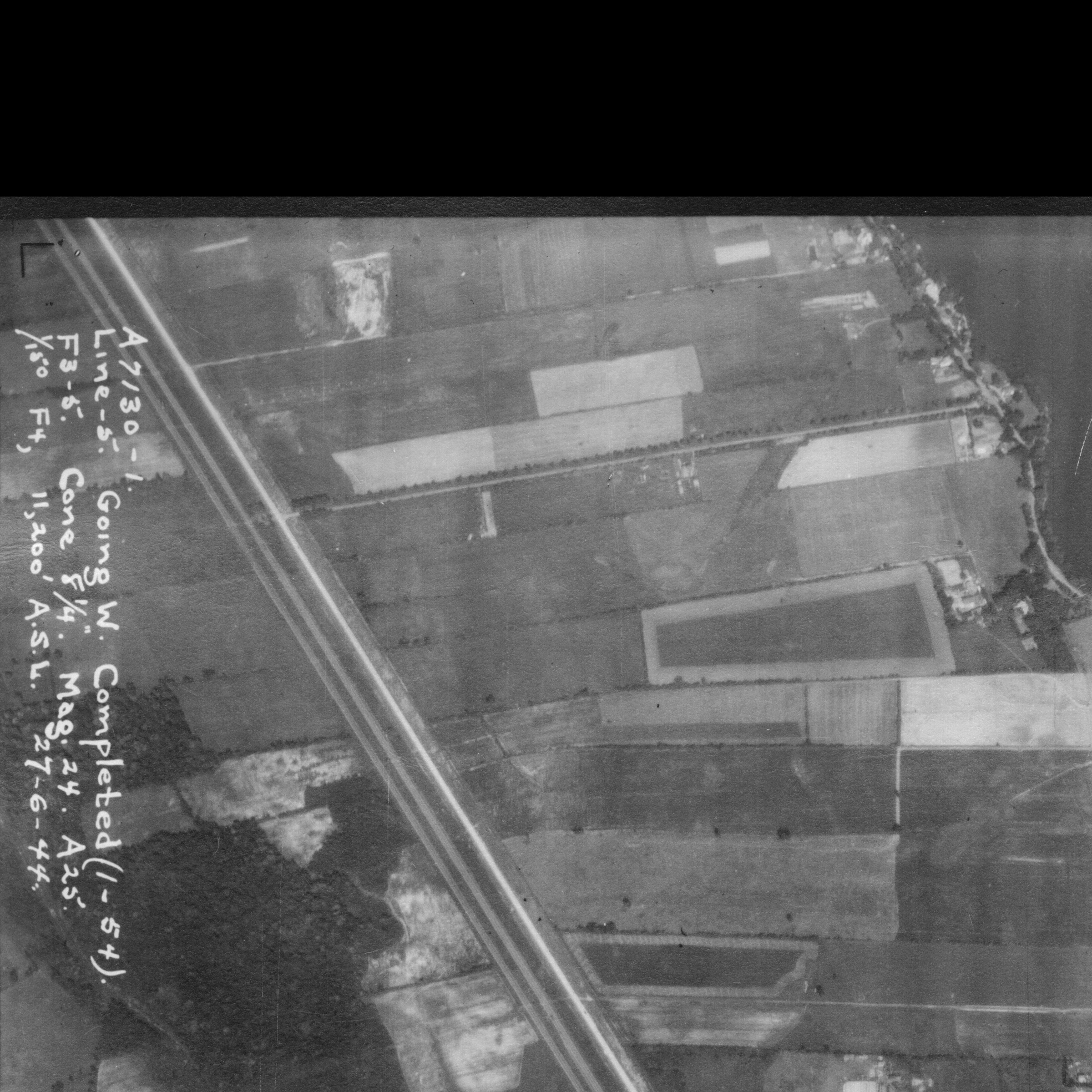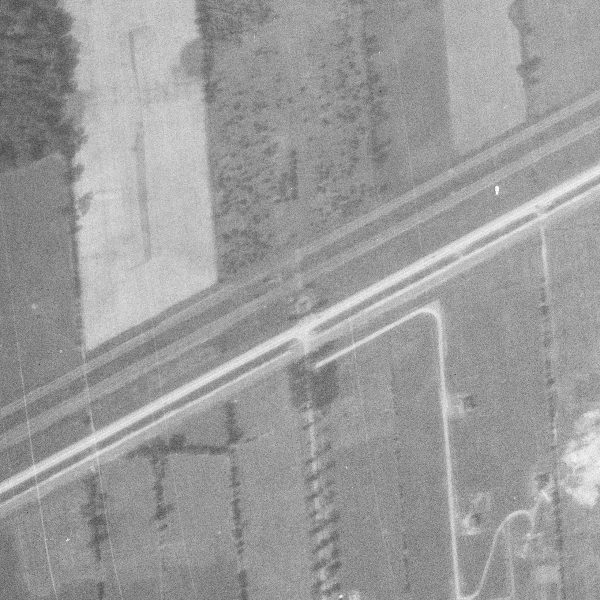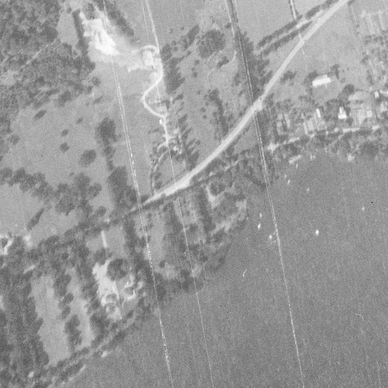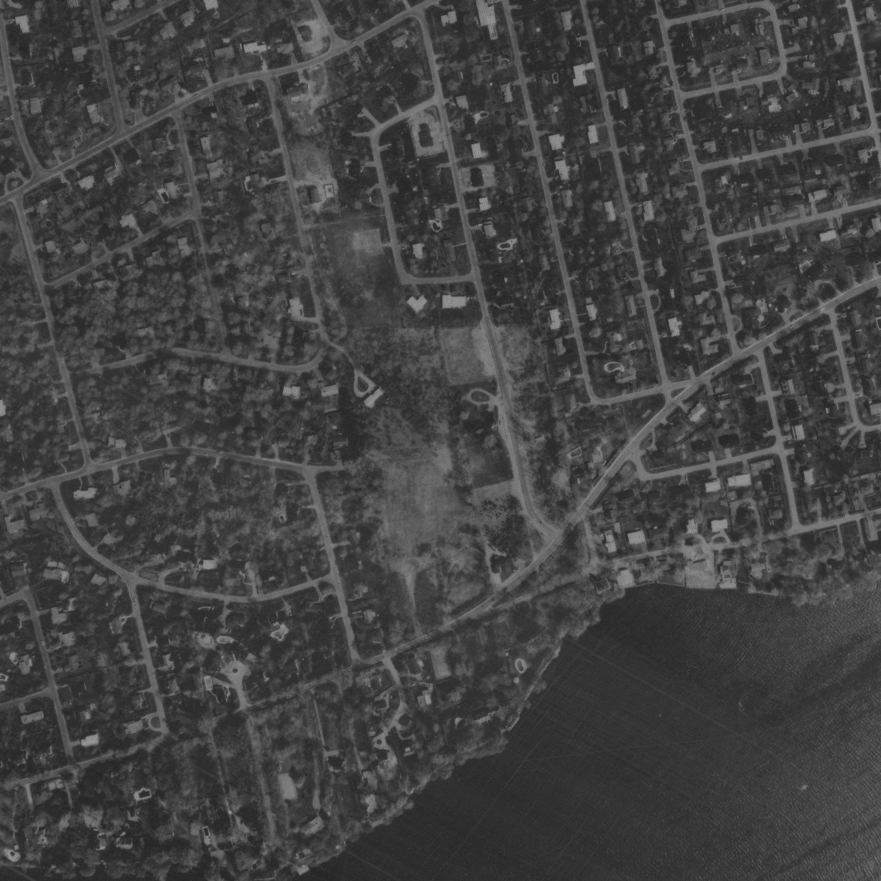 Photo of the town entrance from May 14, 1930, Station Road with turning circle near railway tracks, source: The National Air Photo Library - Natural Resources Canada