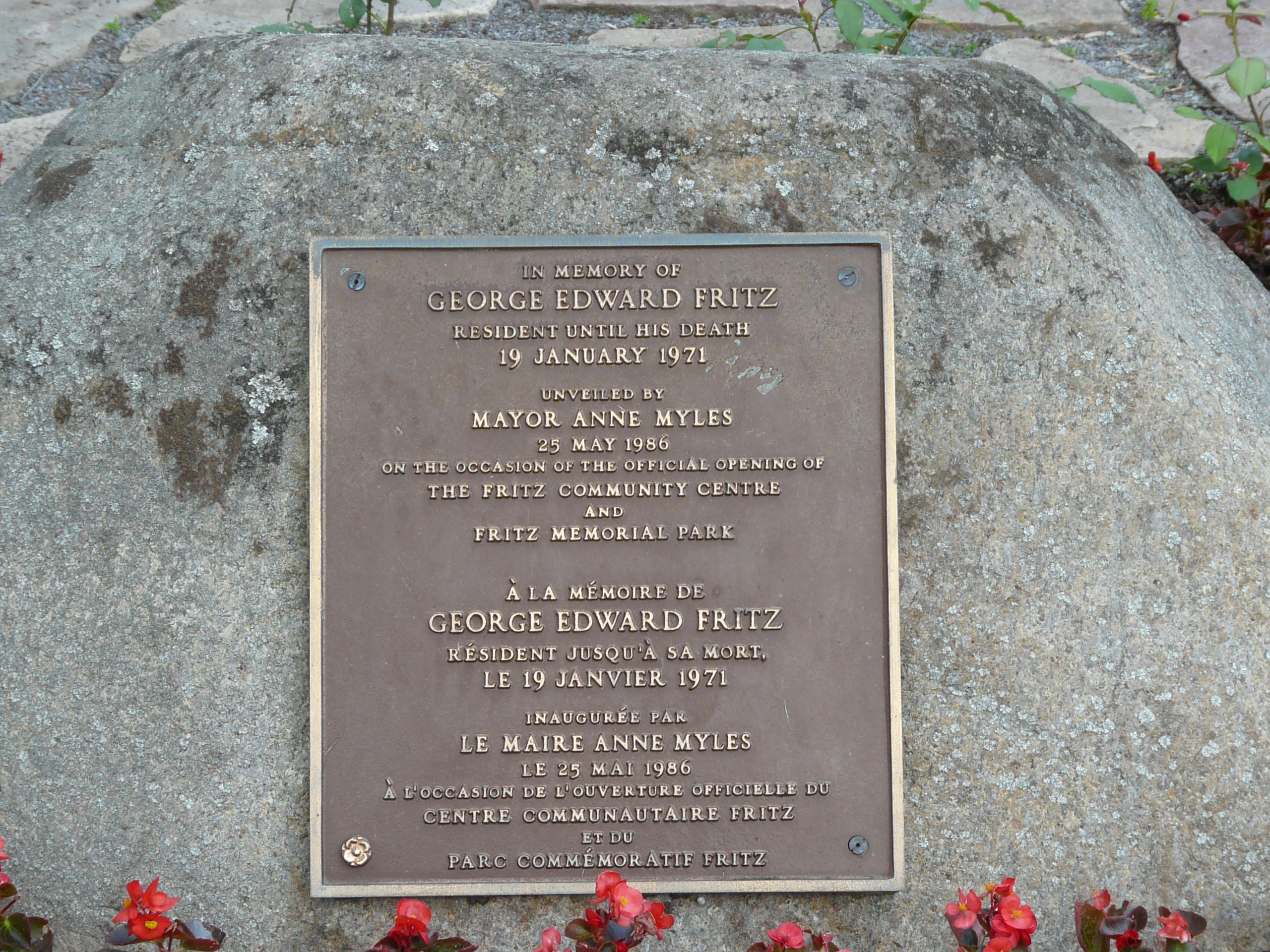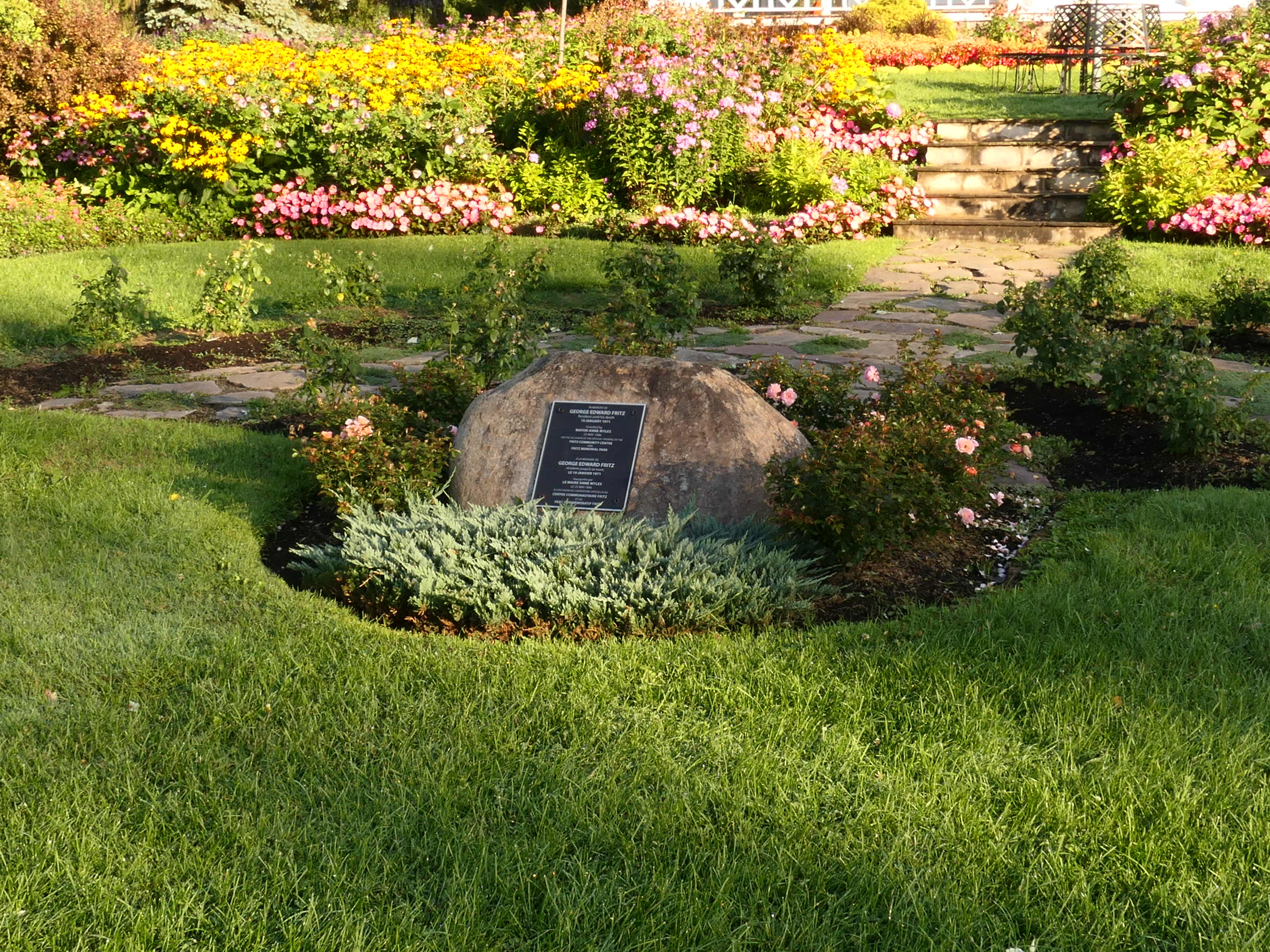 The Fritz Park bandstand, now Ross Common Memorial Bandstand, was a one of Anne Myles favorite projects during the creation of the Fritz Park. Its design is inspired by a bandstand that Anne saw when visiting Perth, Ontario. Initially it was just an architectural showpiece in the park and occasionally used for private family celebrations. The first regular summer concerts started in 1989 and councillor Ross Common was in charge of organizing these concerts. He died unexpectedly in May of 2000. Because of his involvements in the summer concerts and in recognition of his many other volunteer activities in the community it seemed appropriate that the bandstand be named in memory of Ross Common. Ross Common was in charge of the summer concerts until the time of his passing.