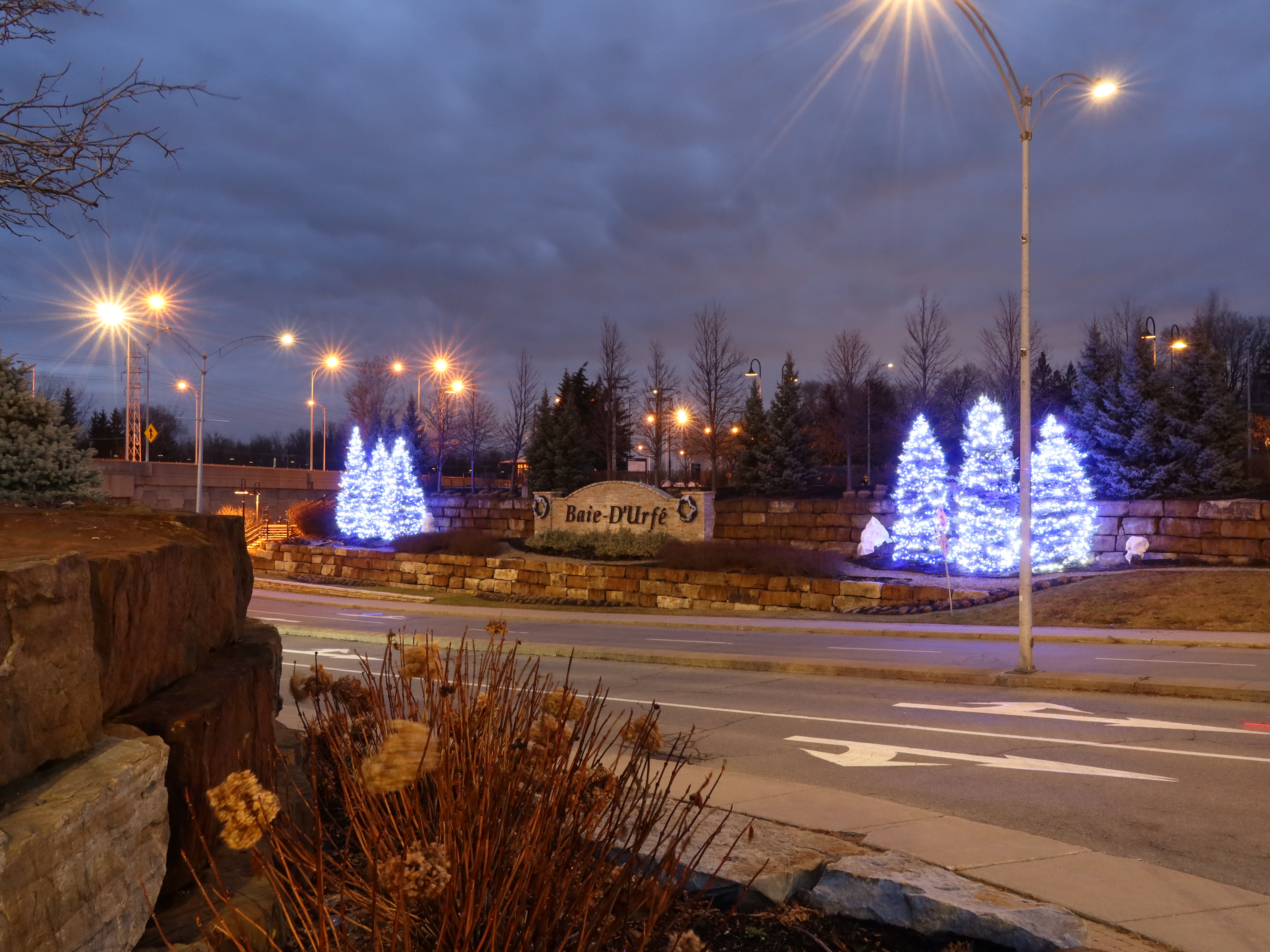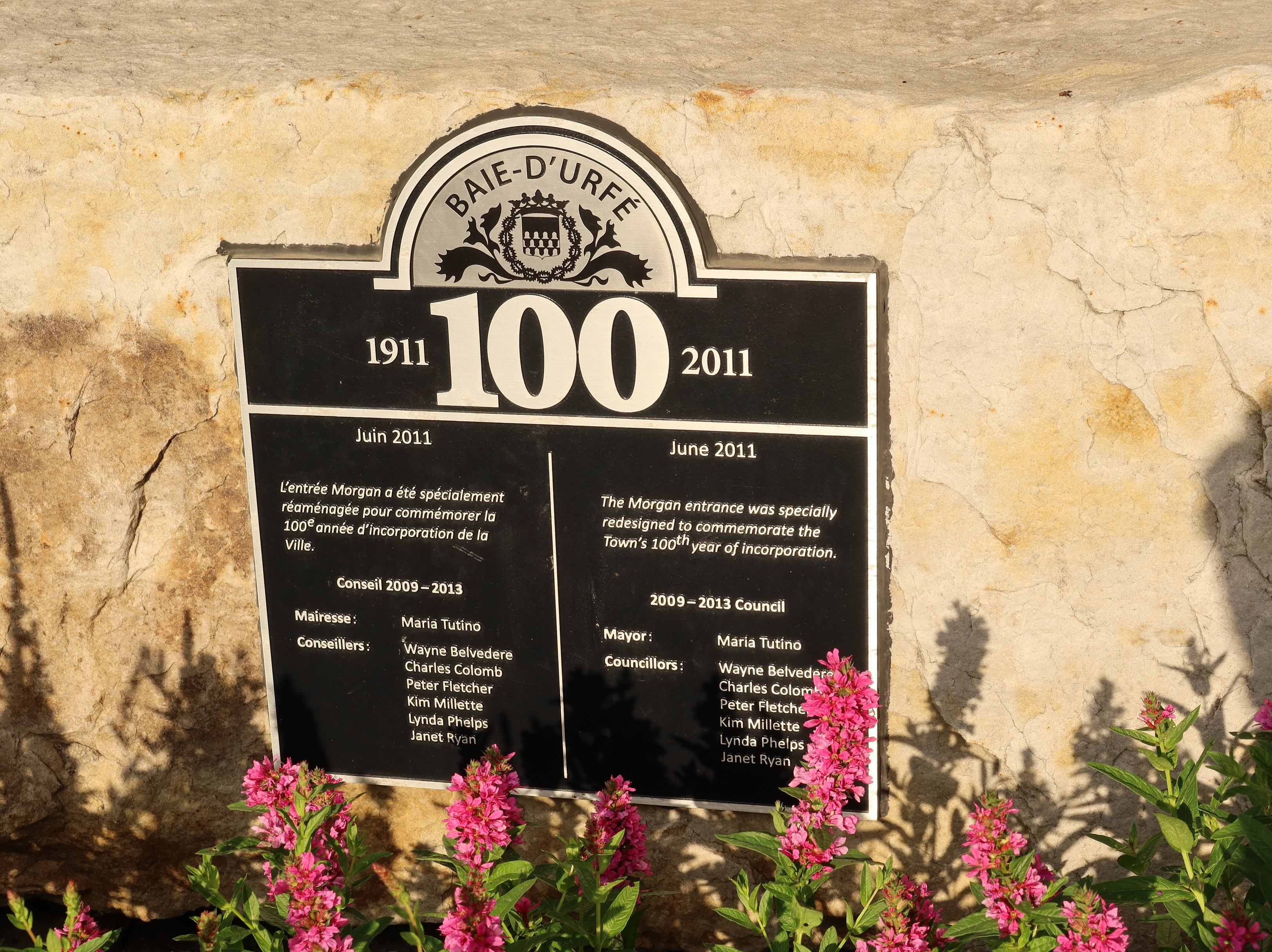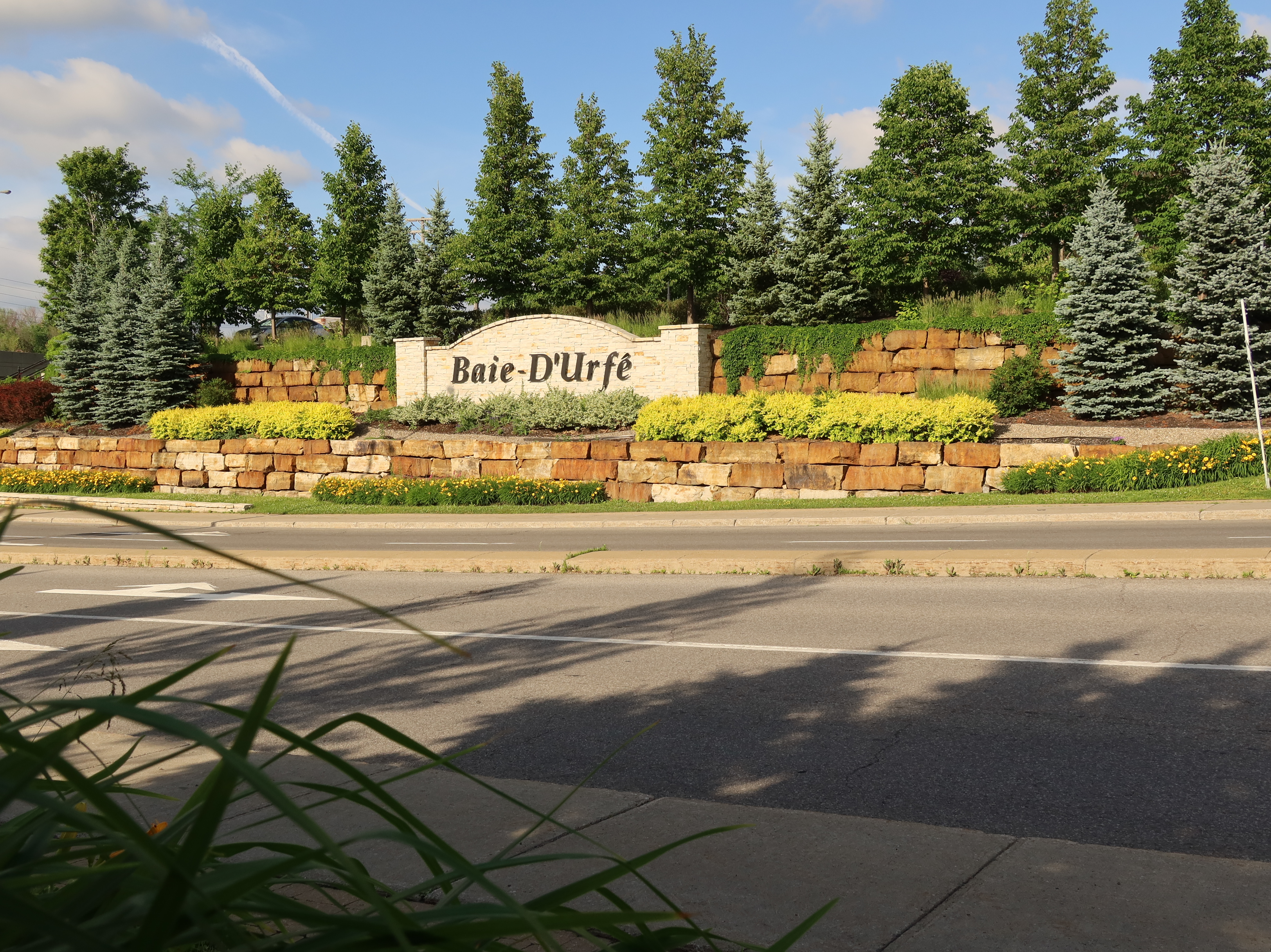 A much nicer entrance area was designed to mark Baie-D'Urfé's 100th year of incorporation. This new entrance with flowers, trees, and natural stone boulders was inaugurated on Sunday, June 19, 2011, by Mayor Maria Tutino.