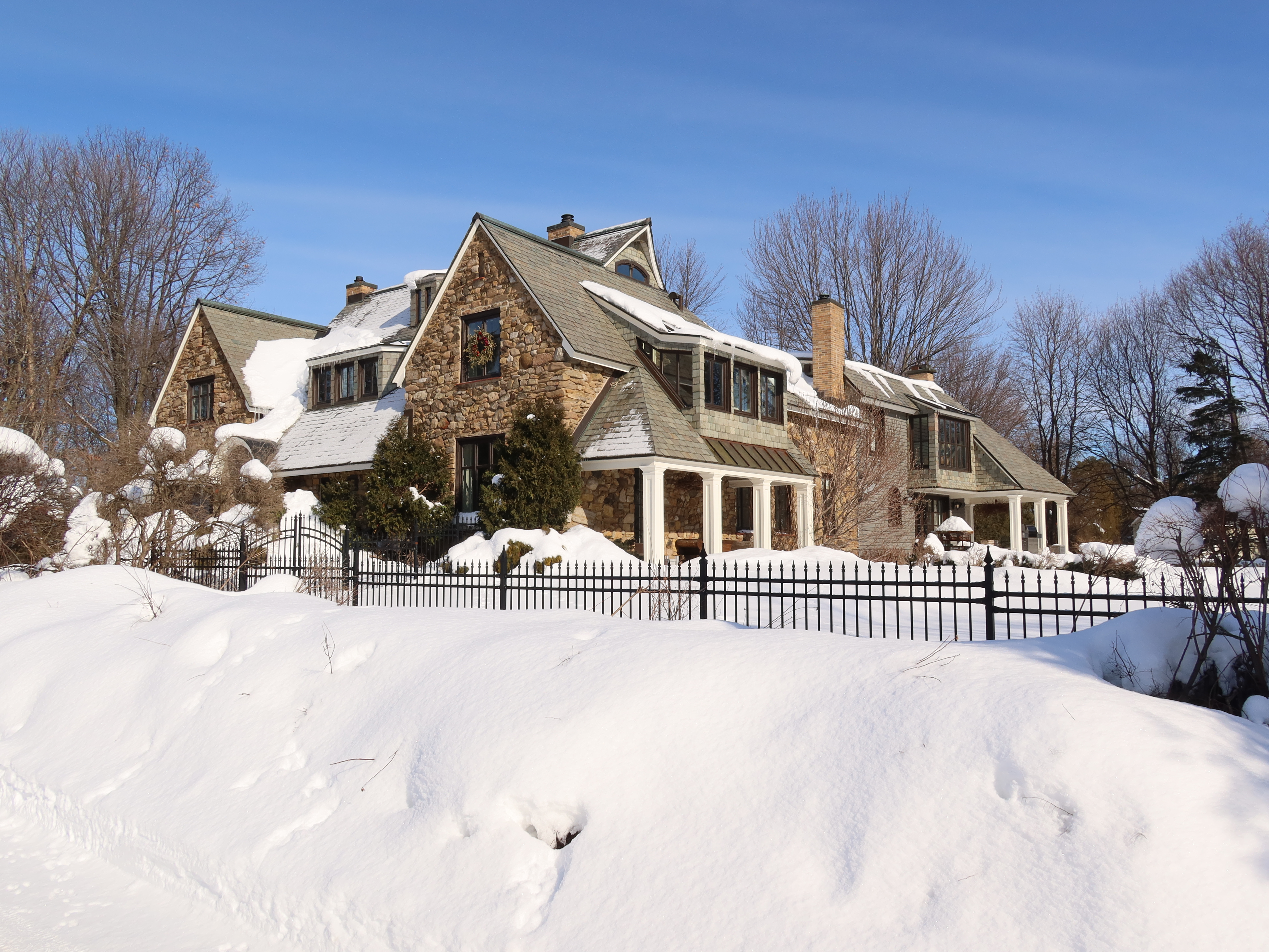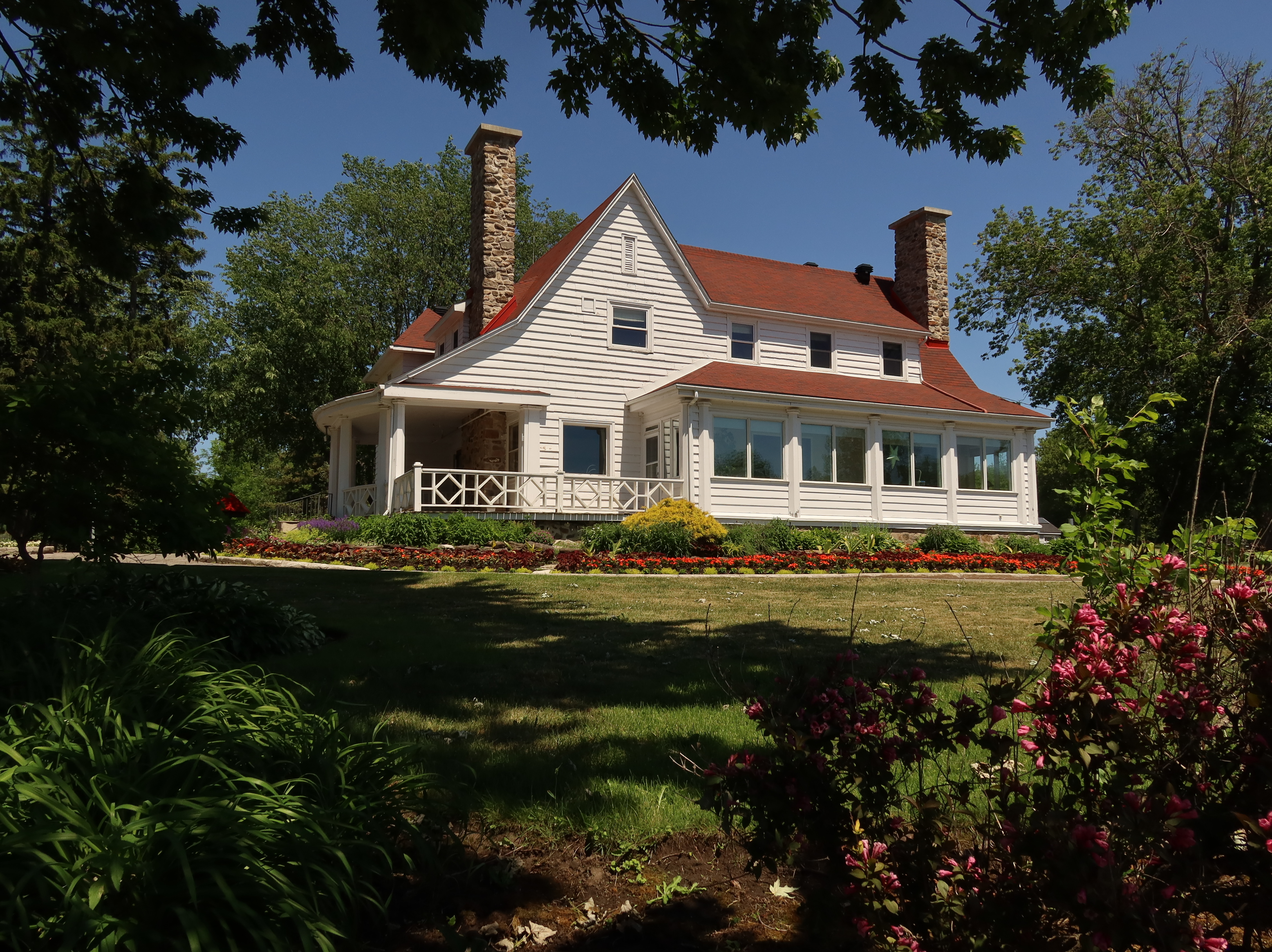 Edward Maxwell used a very interesting design principle for both the Maxwelton and the Baie-D'Urfé Town Hall (see further down). The buildings have corners and pointed roof sections but the roof above the main entrance is round. This idea is taken from nature. Most of us understand it intuitively without being aware of it. The fruits on a fruit tree are round. Animals and humans should go to them and are indeed attracted to them. Other parts are pointed, sometimes even thorny. Think of flowers that have colorful round shapes to attract bees and butterflies while the green leaves are often pointed, sometimes with hard edges or even thorns. On the Maxwelton building the main entrance is not only round but the door has even a dark red color, like a ripe fruit or a flower. Visitors are intuitively guided towards it. It becomes a design that we like without really being fully aware of it and it is because of the design's consistency with the nature around us.
