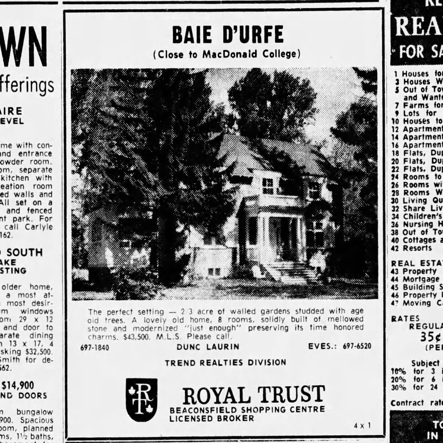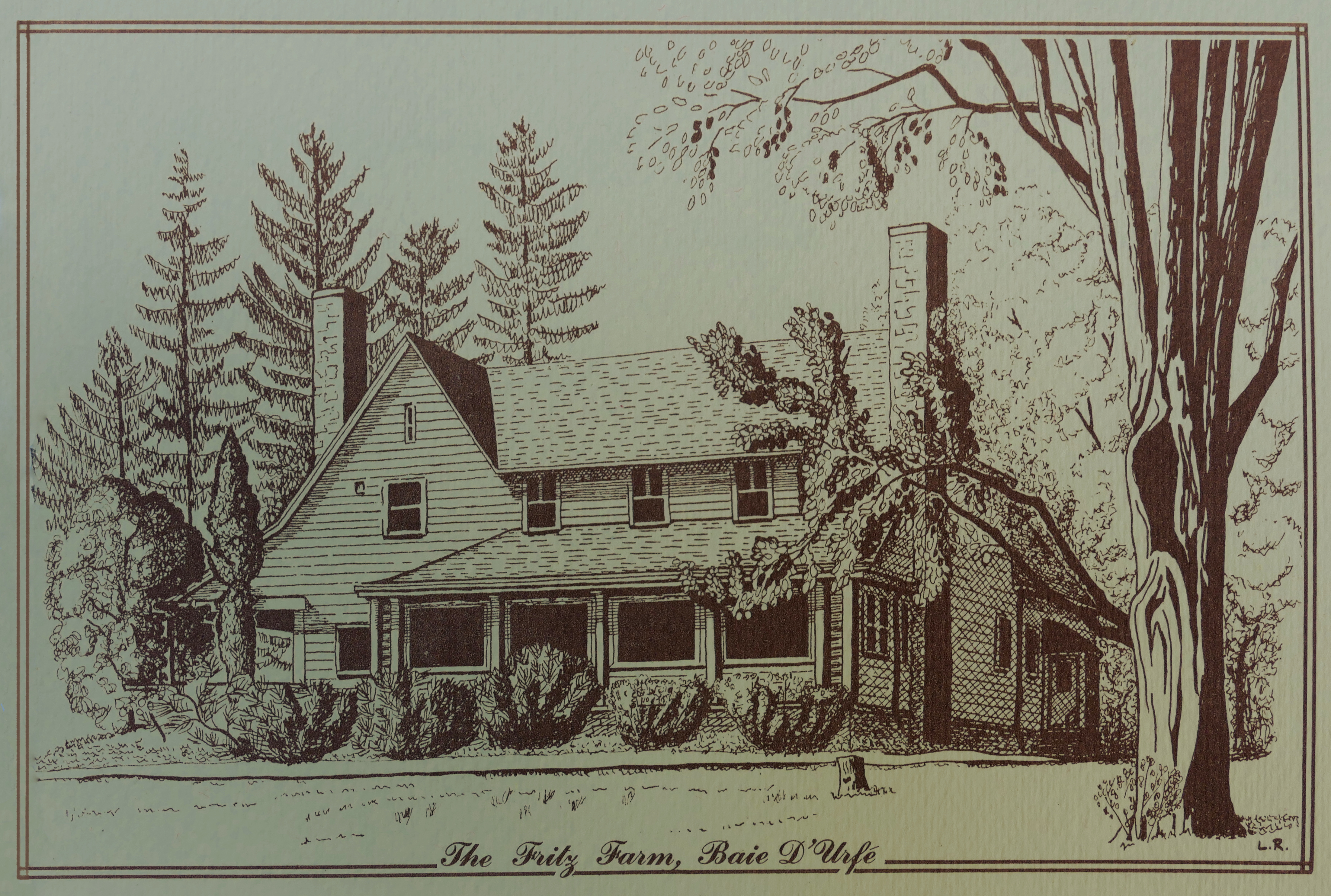 Most of the houses in the eastern part of Baie-D'Urfé were only built around 1960 and 1970. The farm of architect Edward Maxwell used to be in this area. It was known as the Maxwelton Dairy Farm. Mr. Maxwell died in 1923 but the farm continued under professional management until 1939, when daughter Elizabeth (1908-1969) returned with her husband Christopher Montagu Yates (known as Monty, 1899-1984) and the twin boys, Ted and Henry, to live year-round in the big farmhouse.