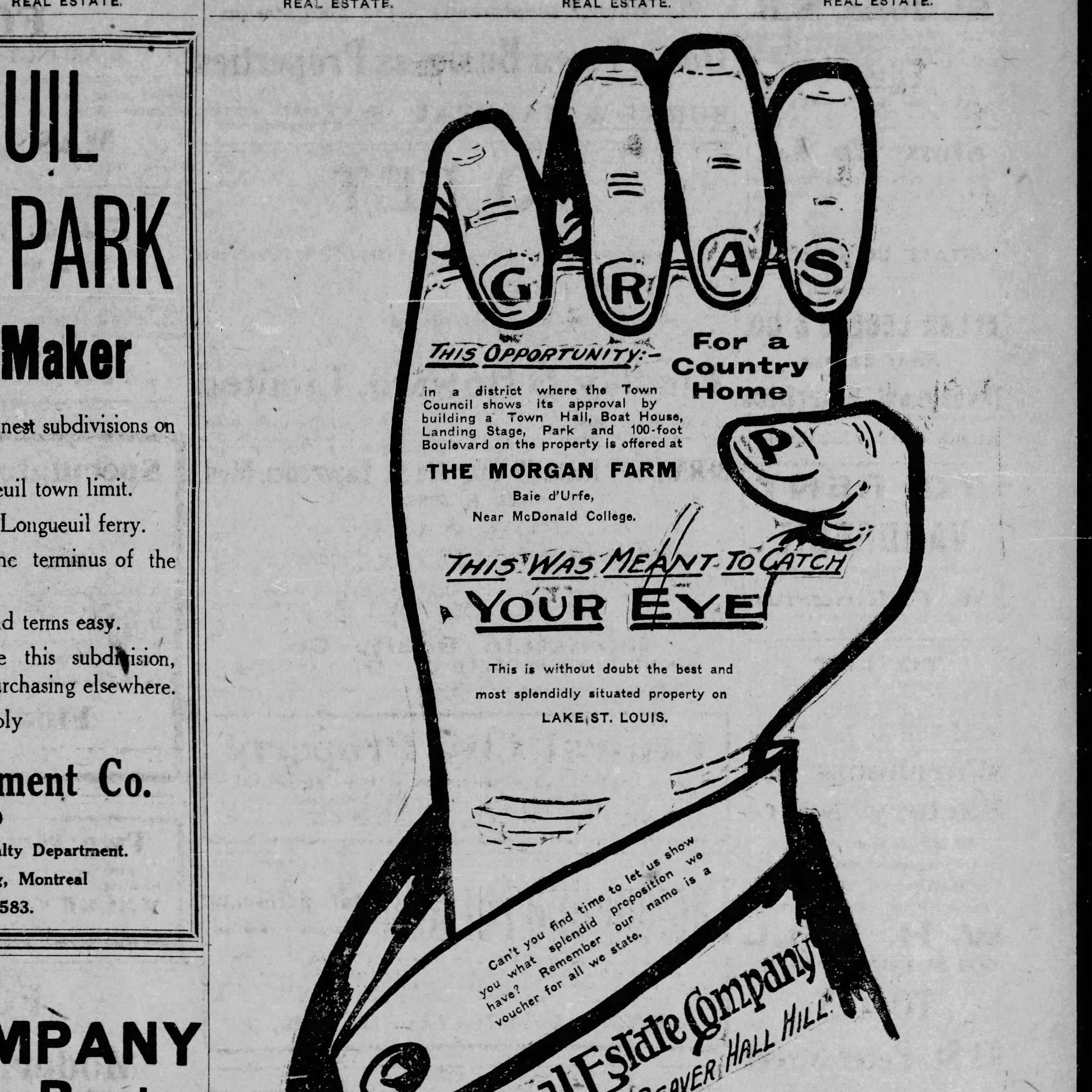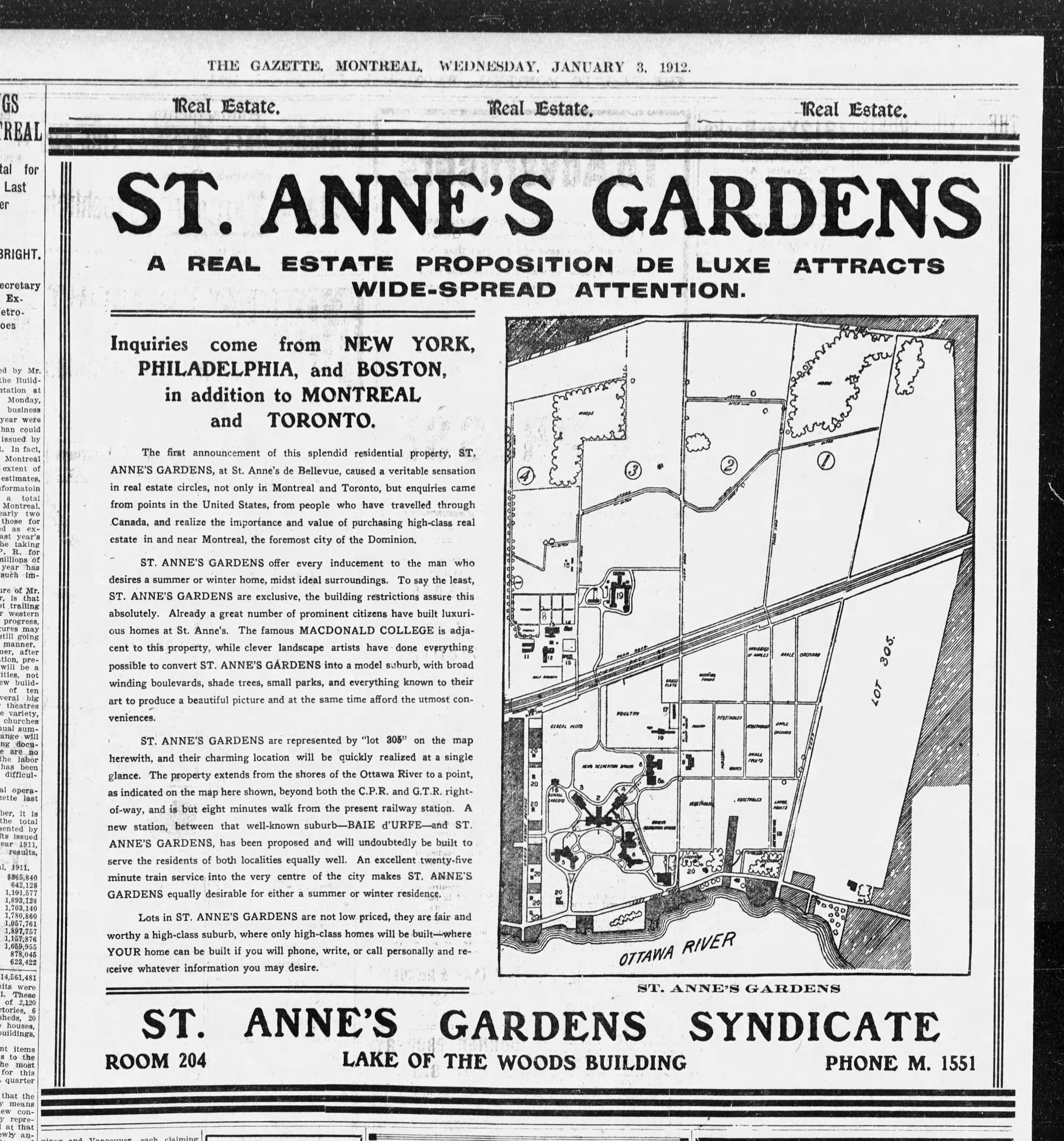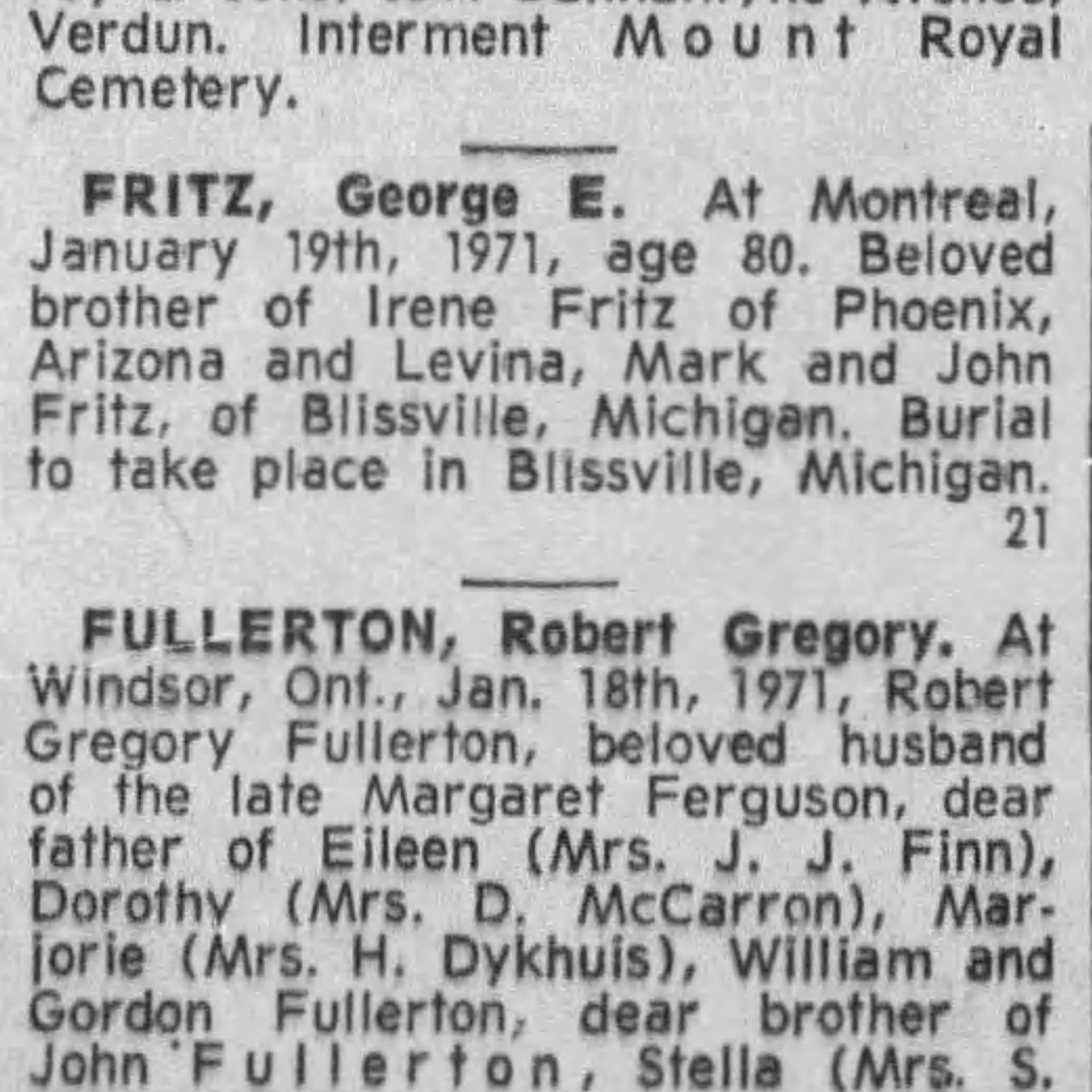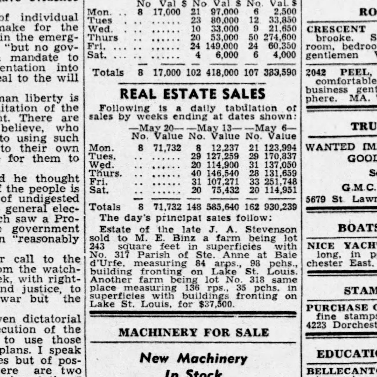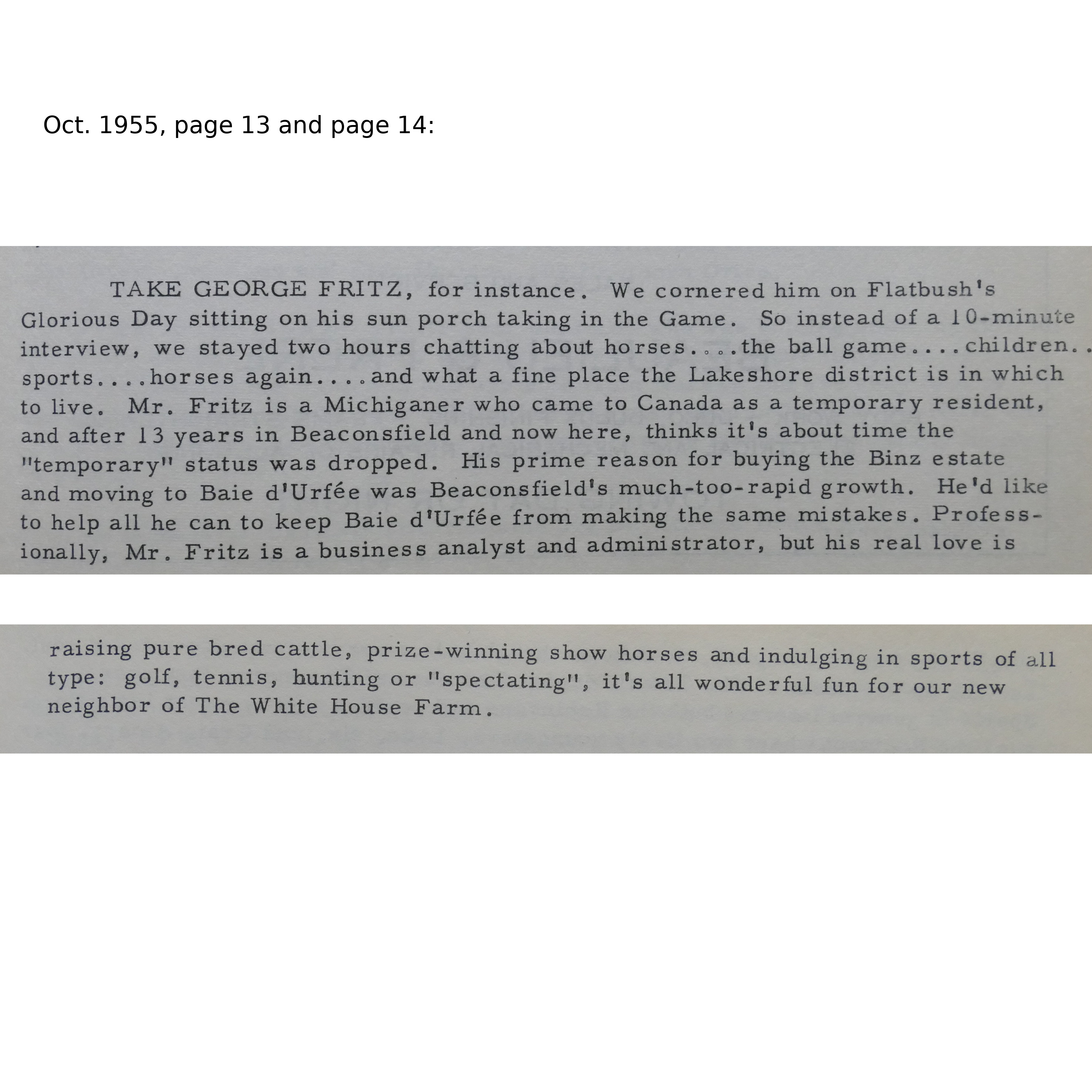 Max E. Binz (1896-1955), a textile manufacturer who had emigrated to Canada from Switzerland, bought farm lots 317 and 318 at the beginning of May 1944 from the J. A. Stevenson estate. He paid just $37500 after the estate had been unsuccessful at selling it for over 30 years. Mr. Binz owned already the lot to the west, 316, which he had purchased from the Pilon family. Most of the land was gradually sold off after 1945. Mr. George Fritz, a businessman, bought the remaining land, 19 acres, during the summer of 1955. He kept a small herd of sheep, black Angus, horses and ponies. Children could come for pony rides and learn how to take care of the animals. George E. Fritz was born Nov. 10, 1890 in Blissfield, Michigan, son of John George Fritz and Caroline C. Fritz. John had immigrated to the US from Germany while Caroline was born in Michigan to German parents. George Fritz died Jan. 19, 1971 in Montreal but wanted to be buried in the family plot in Blissfield, Michigan. He was not married but lived with Pauline Charron at the "Fritz Farm" until his death.