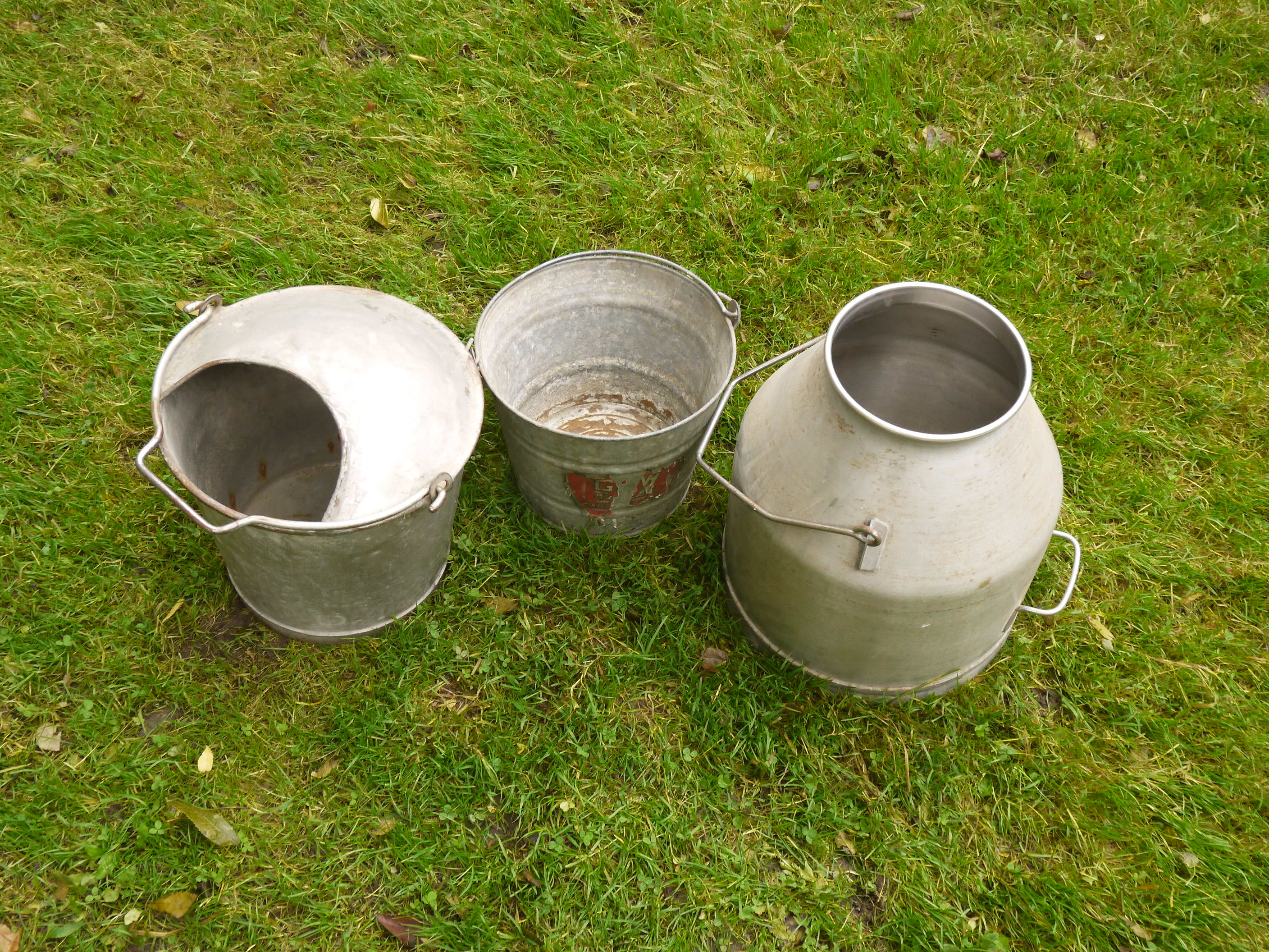 Various heavy gauge tin buckets from the Maxwelton Farm. The one on the right attaches to a mechanical milking machine, photo: October 2023, source: Henry Yates