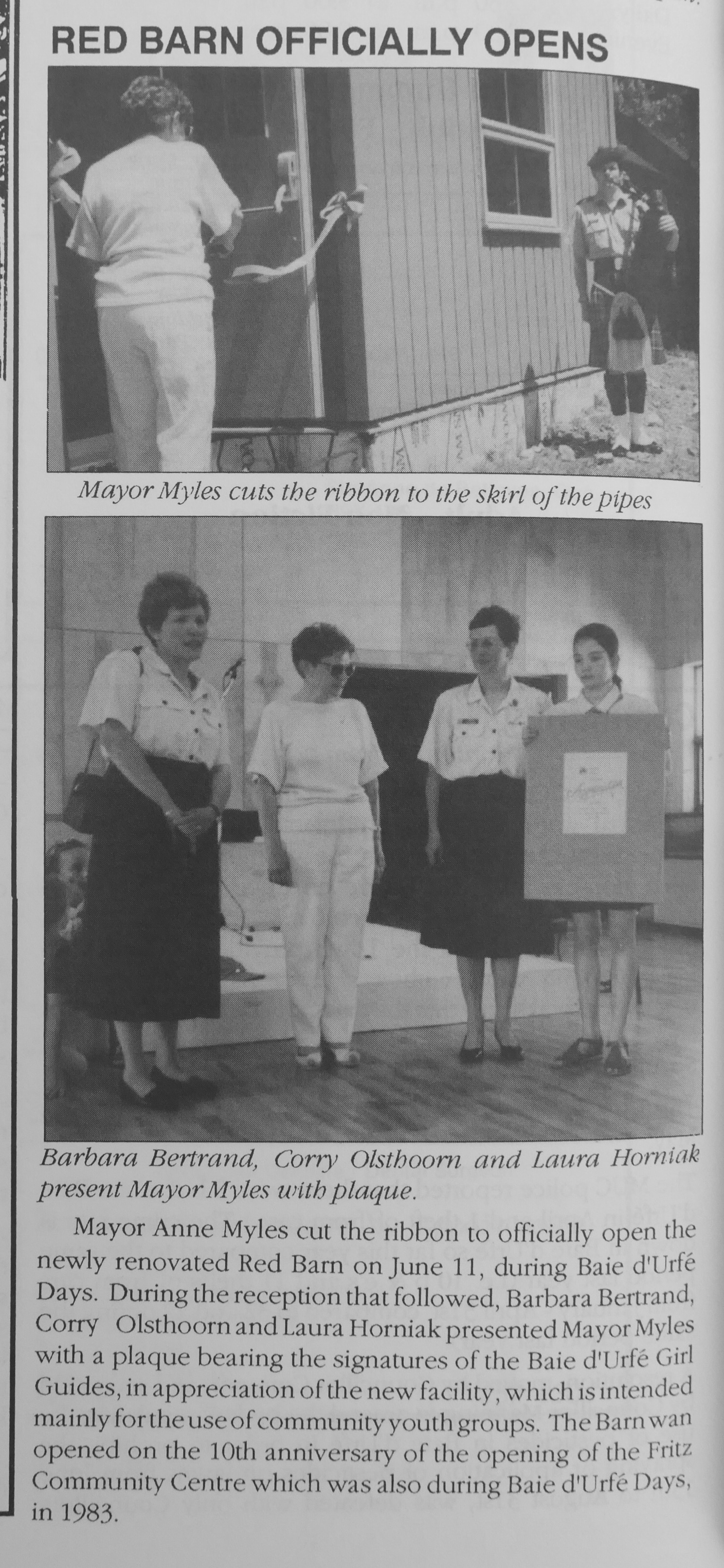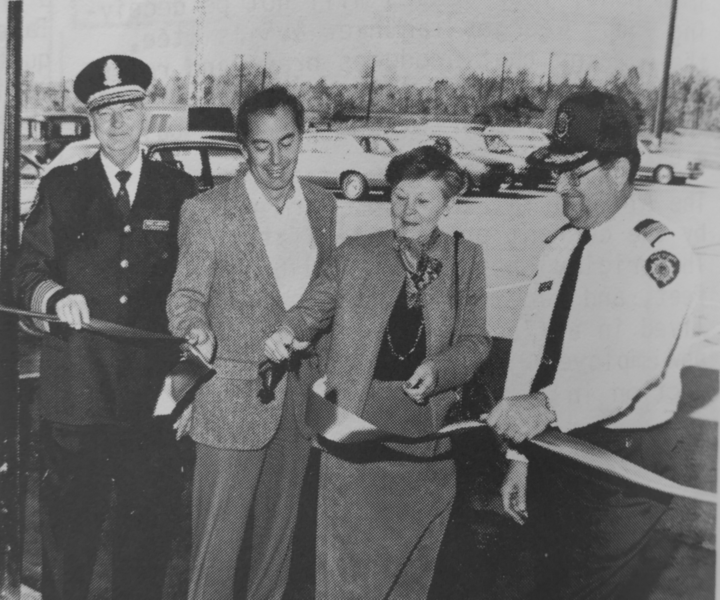 Official opening of the public works building, September 28, 1985, source: N&V Nov 1985, left to right: Fire Chief René Larente, Director of Operations Richard White, Mayor Anne Myles, Captain André Berard
