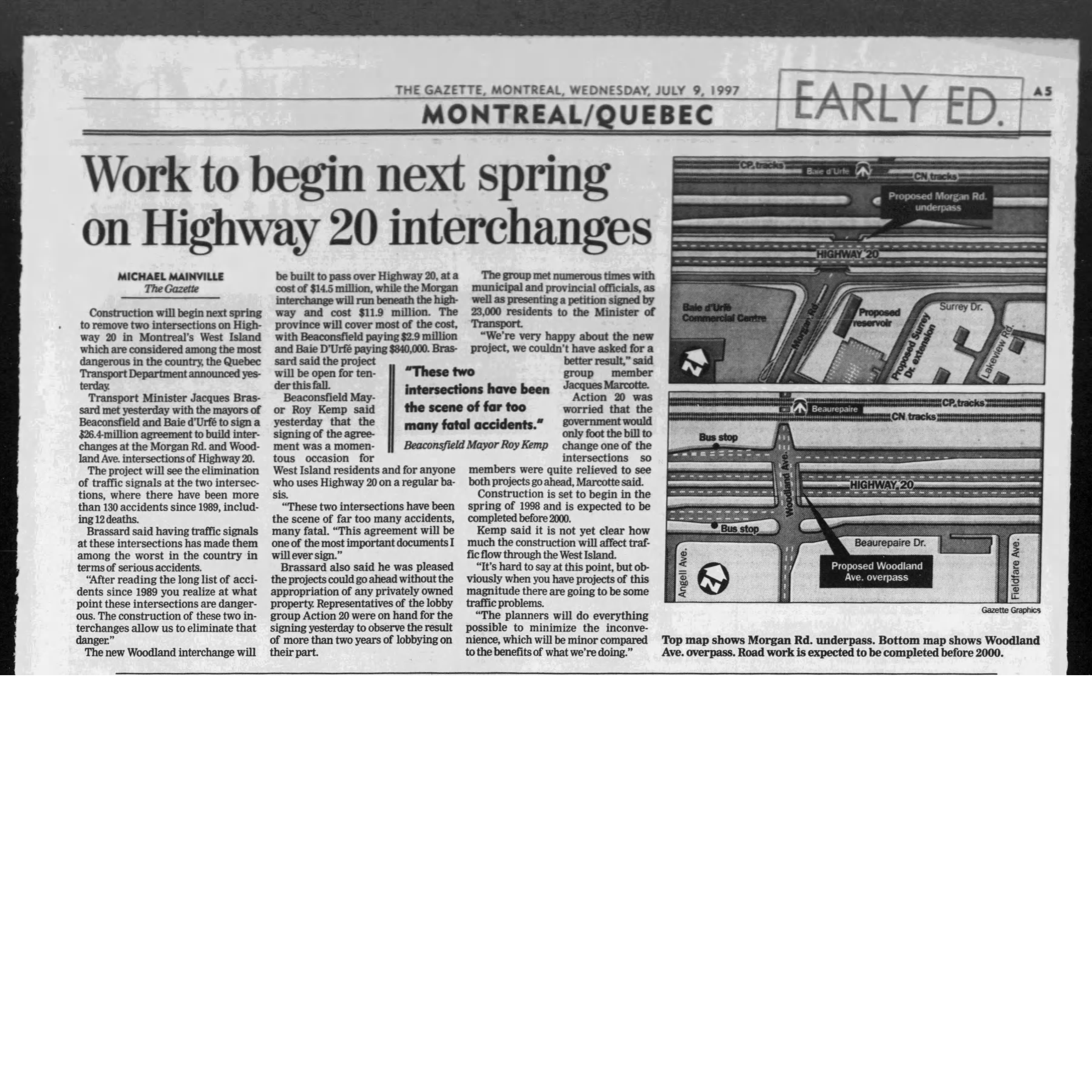 As traffic on the highway increased even more in the 1970s and 1980s, the crossings at Morgen Road in Baie-D'Urfé and at Woodland in Beaconsfield, were among the most dangerous crossings in all of Quebec. Many deadly accidents happened despite efforts to increase the safety with road markings and extra warning lights.