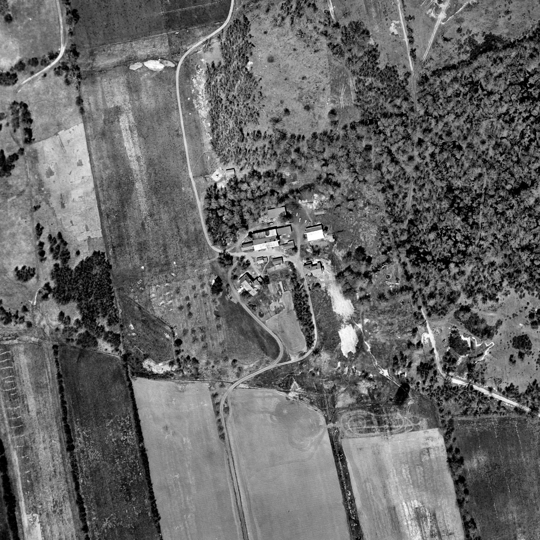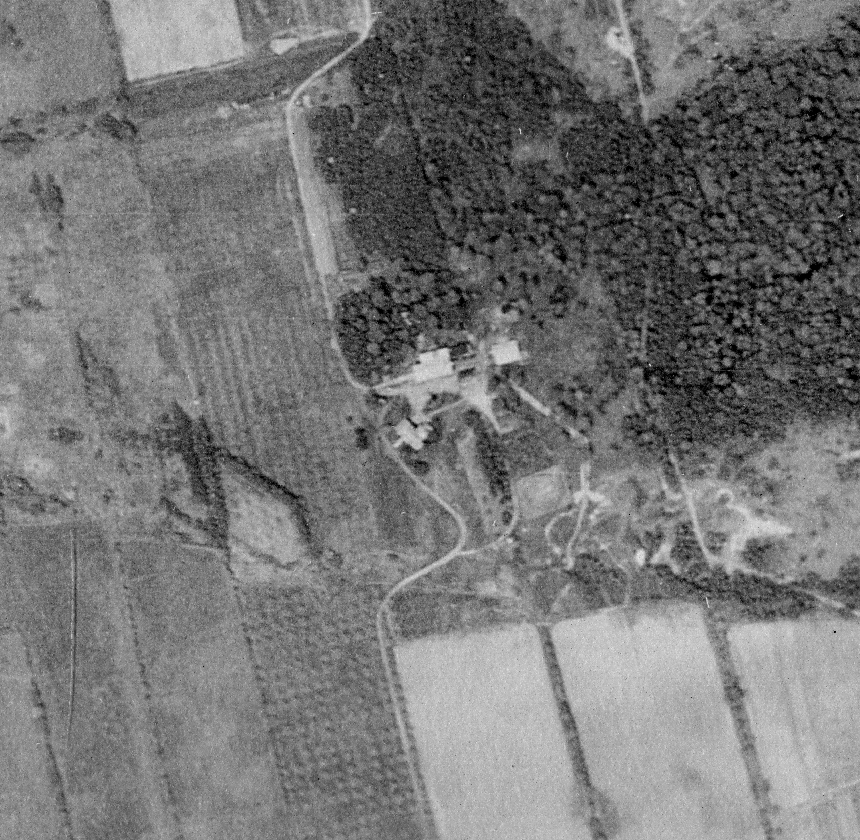 Maxwelton 1948-Aug-25, only a few apple trees near the main house remain, photo: The National Air Photo Library - Natural Resources Canada