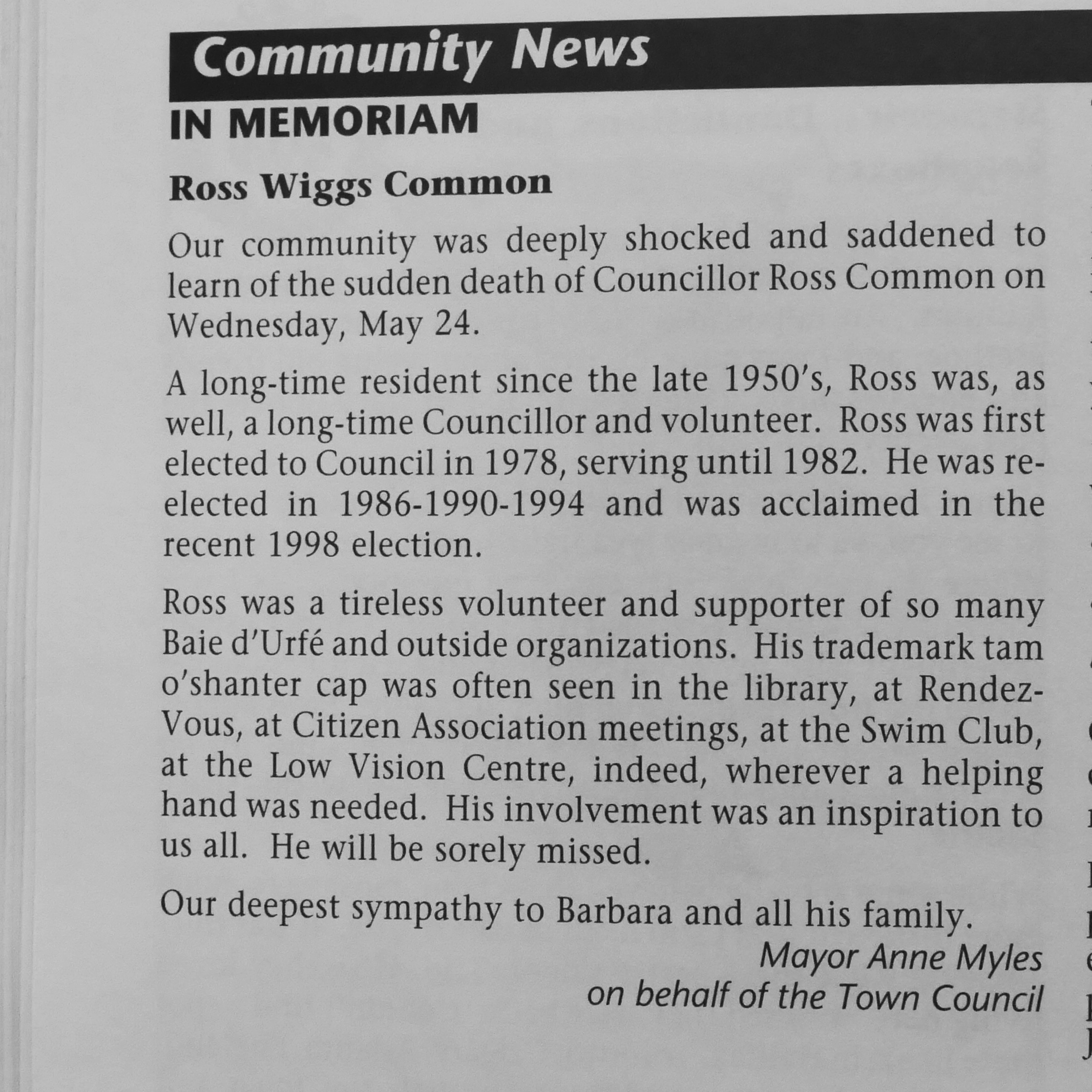In memoriam, Ross Wiggs Common died May 24, 2000, source: N&V June 2000